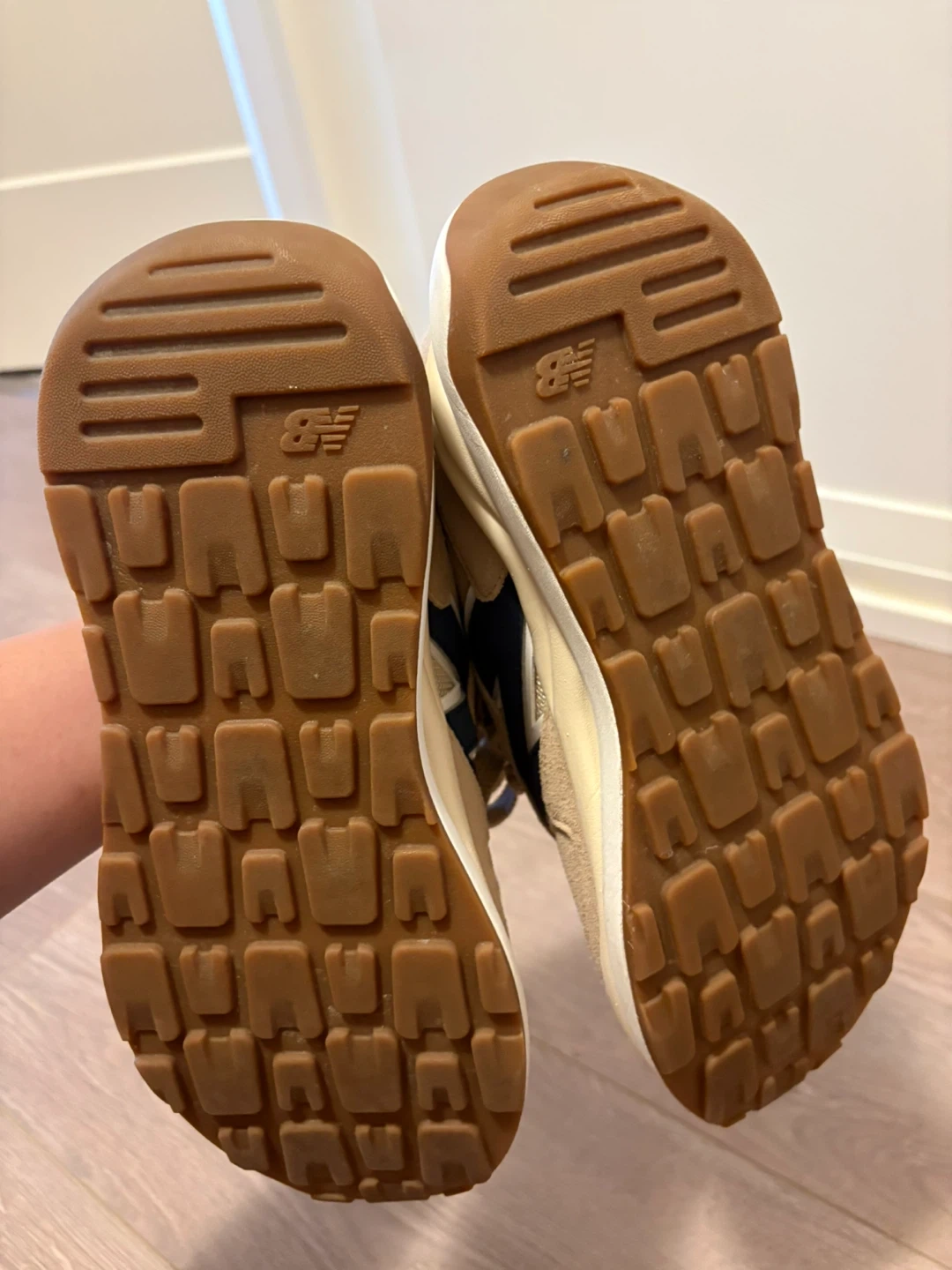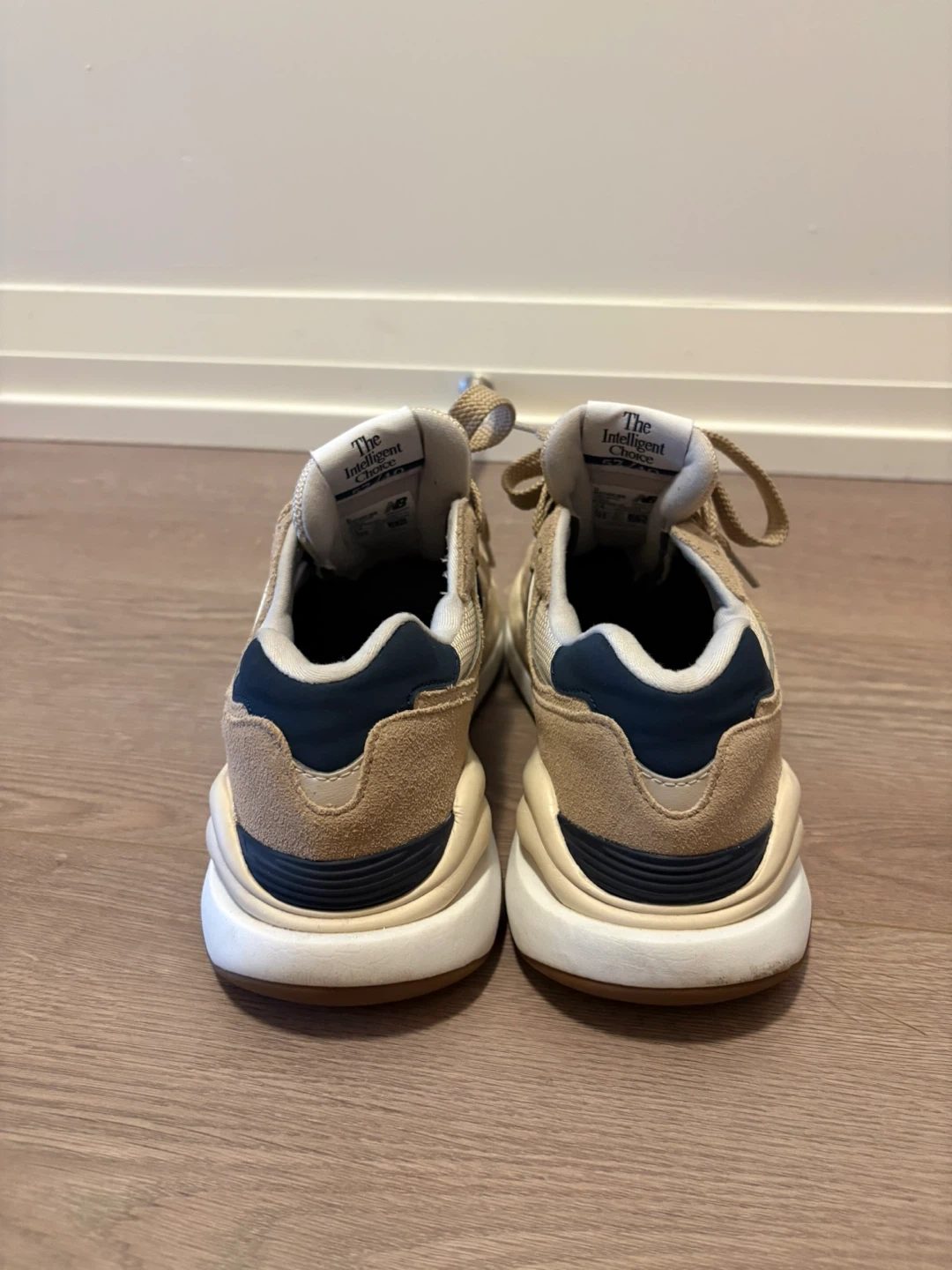 Beige sneakers with navy accents. Comfortable and stylish. Ideal for everyday wear.