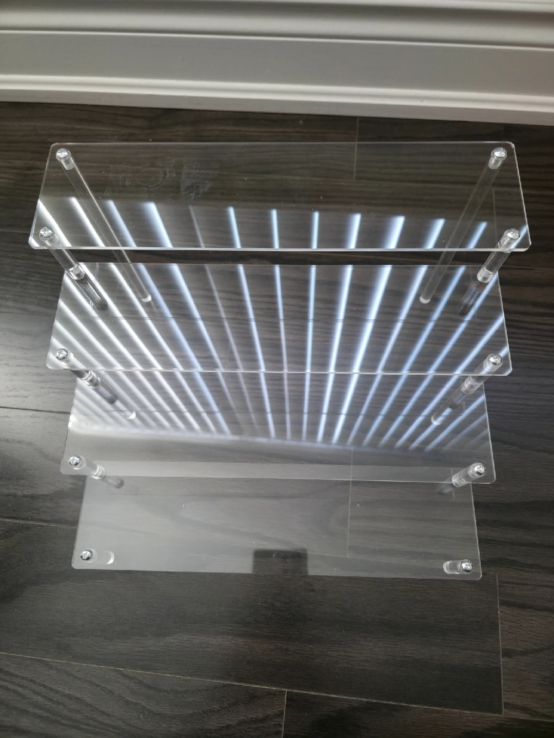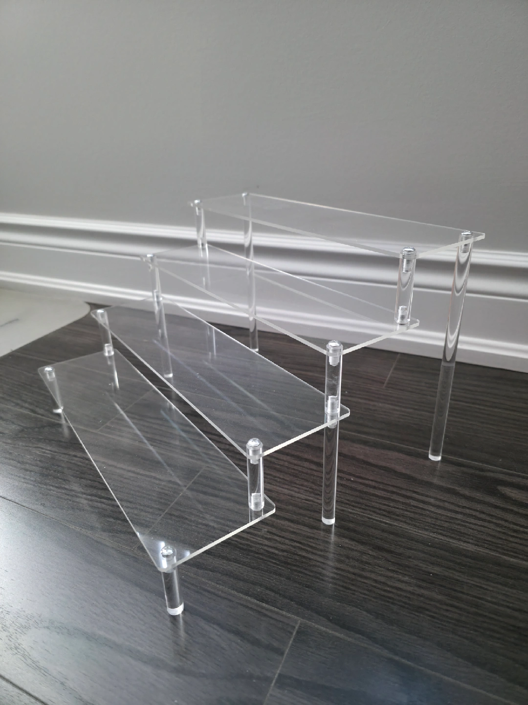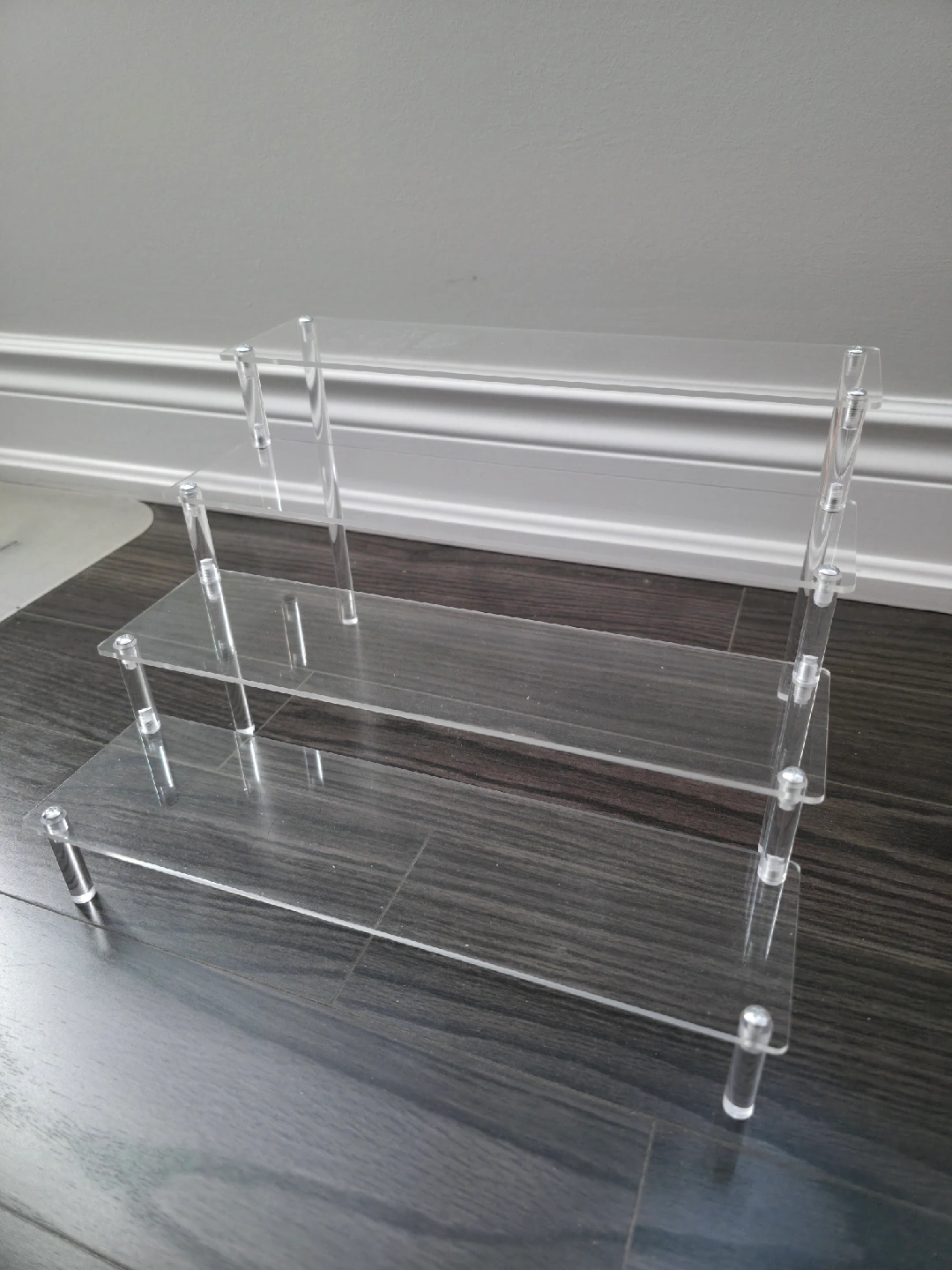 Selling a clear acrylic display stand! It's perfect for showcasing items on 4 tiers. Great for organizing and displaying your favourite things! 1 for $15. Have 4 of these
