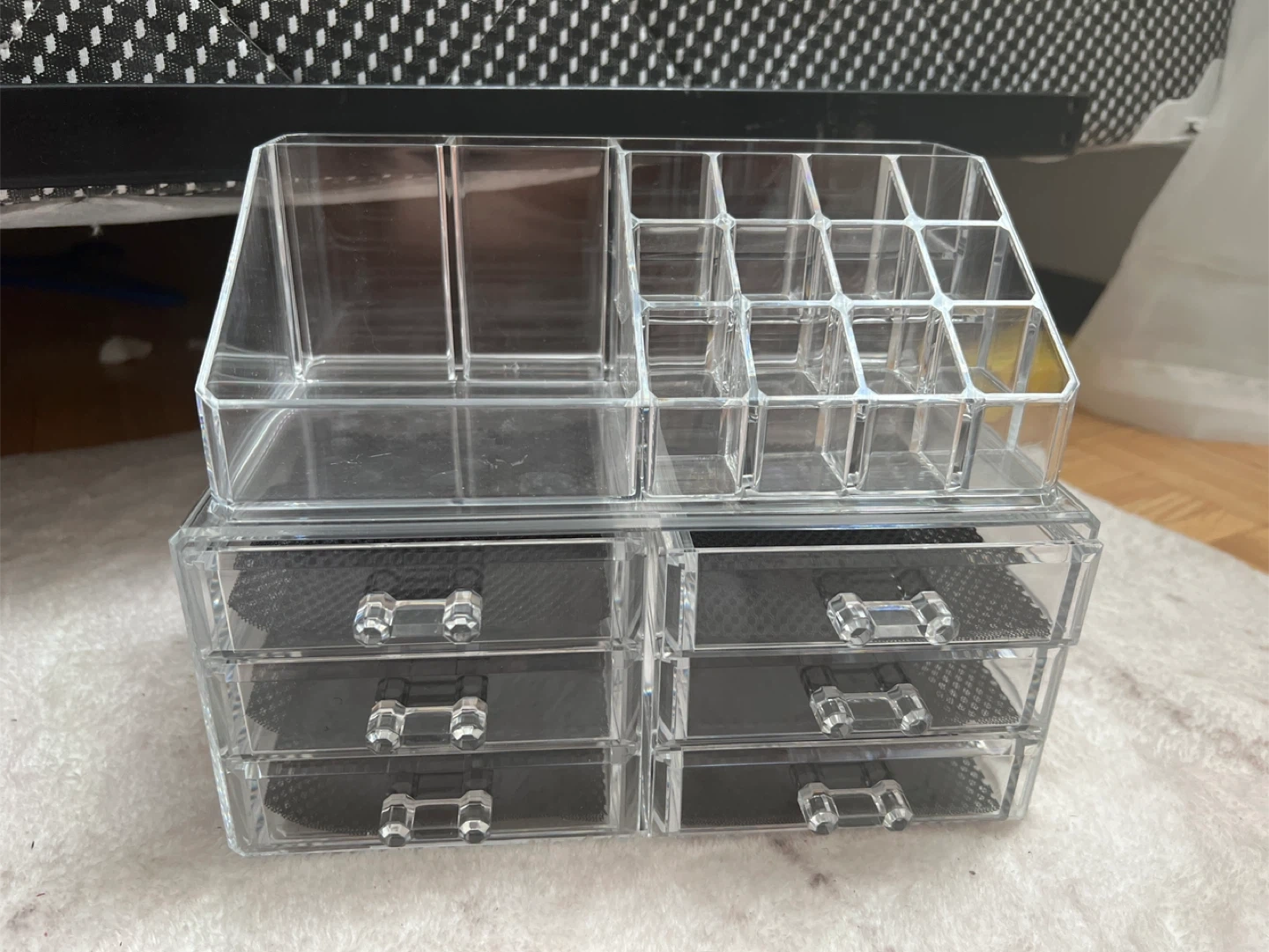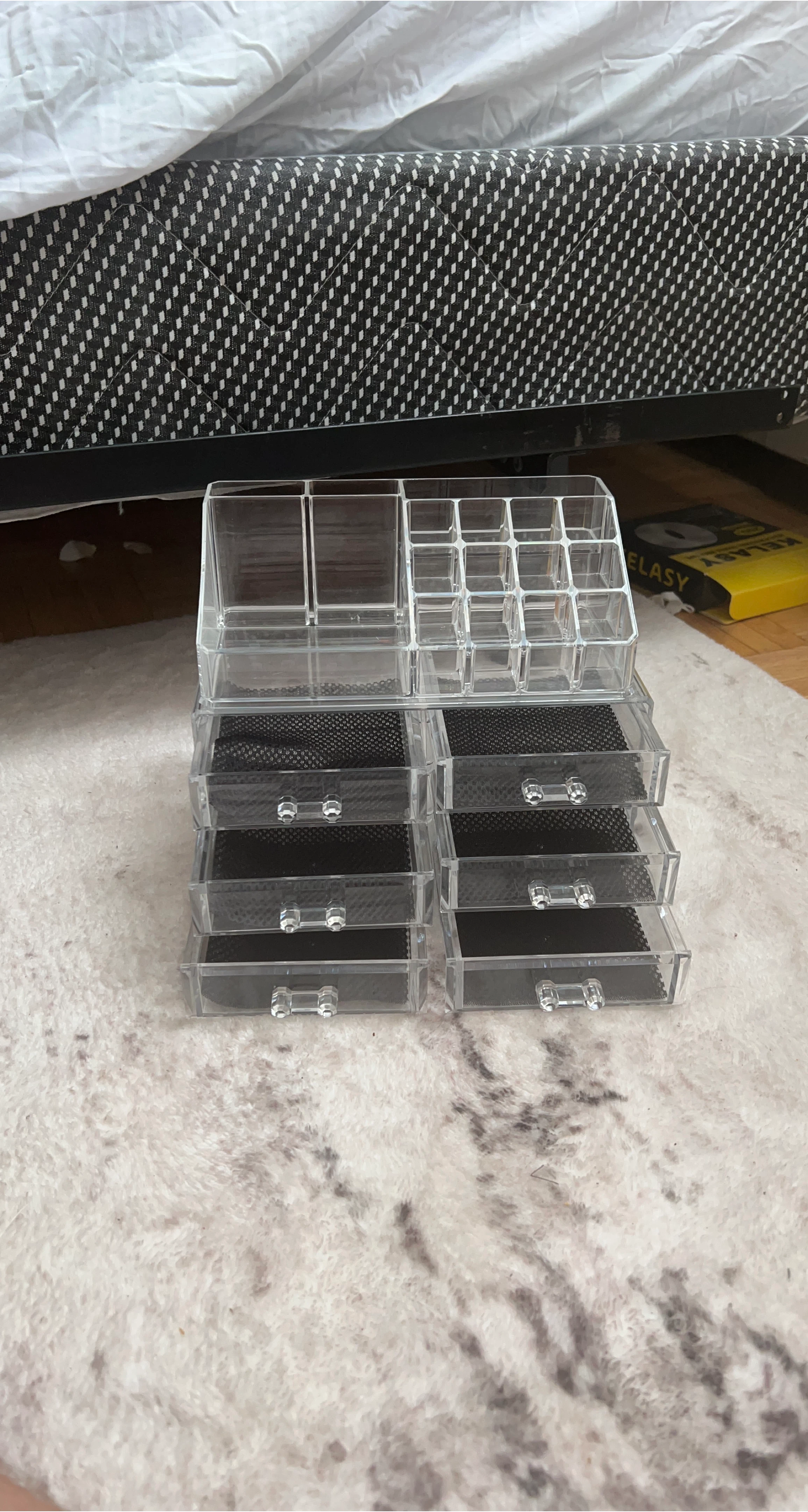 Selling a clear acrylic makeup organizer! It has multiple compartments and drawers, perfect for keeping your cosmetics tidy and accessible. It's in great shape and ready to help someone organize their space