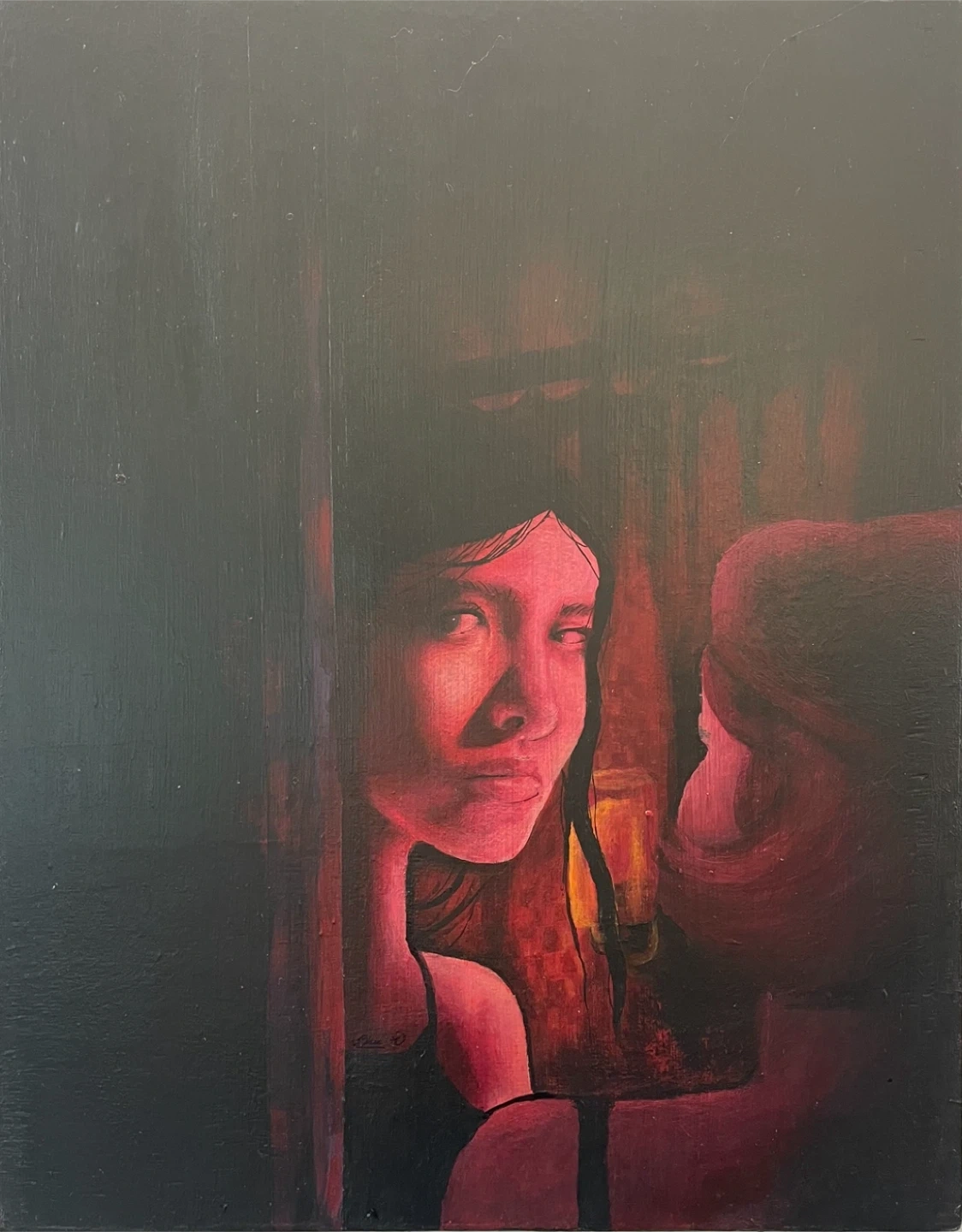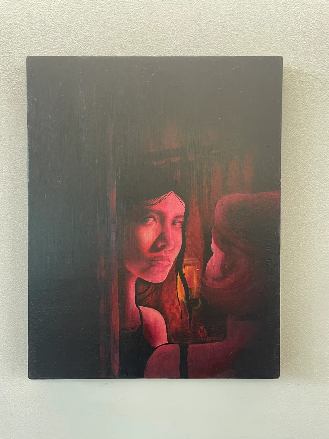 Acrylic painting created by me, titled “memory mirror” where a woman is portrayed seeing her younger self in the mirror’s reflection while her present self stands looking into it.