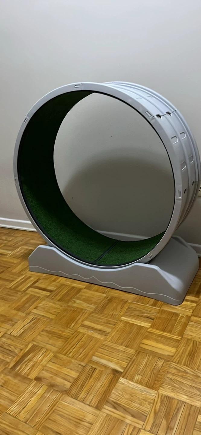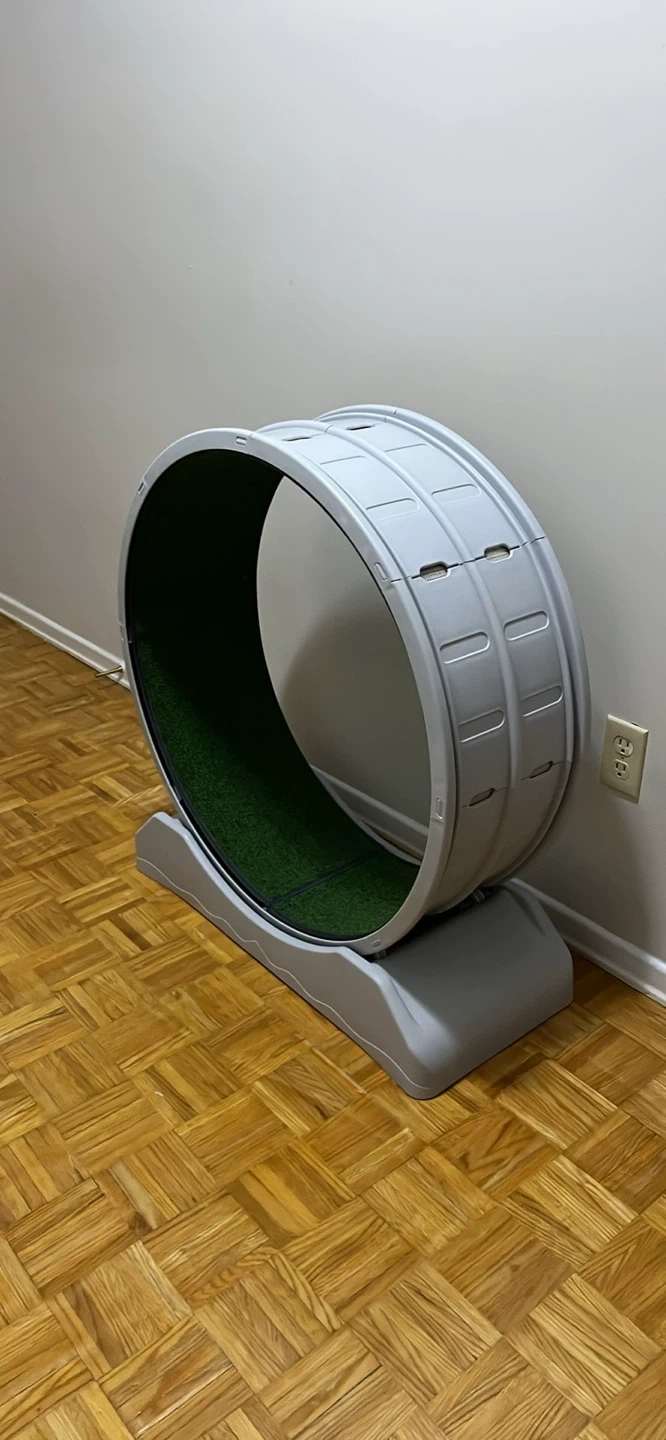 A grey cat exercise wheel with a green carpeted interior. It's designed for cats to run and play, providing them with a way to burn off energy indoors.