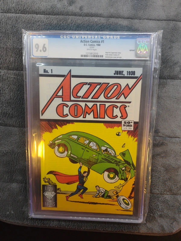 Selling Action Comics #1, a reprint from D.C. Comics, 1988. This comic is a CGC Universal Grade 9.6 and features white pages. It reprints the original Superman story from Action Comics and the anniversary cover.