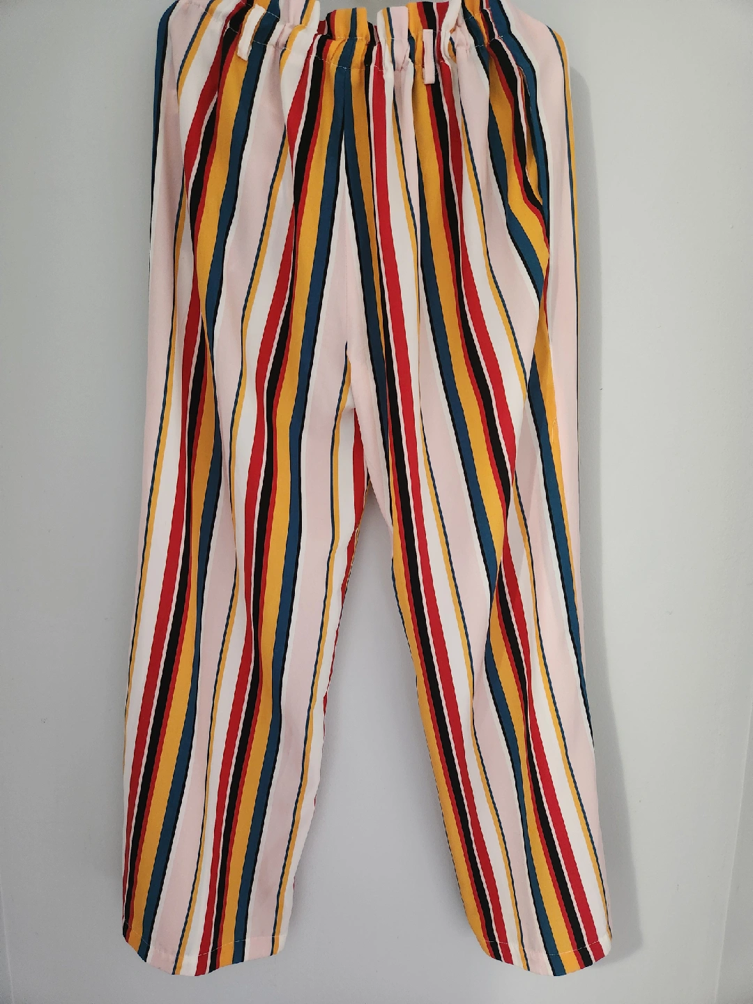 Colorful striped trousers from ACTIVE USA, size small! They feature a comfortable elastic waistband and a stylish, eye-catching design. Perfect for adding a pop of colour to your wardrobe!