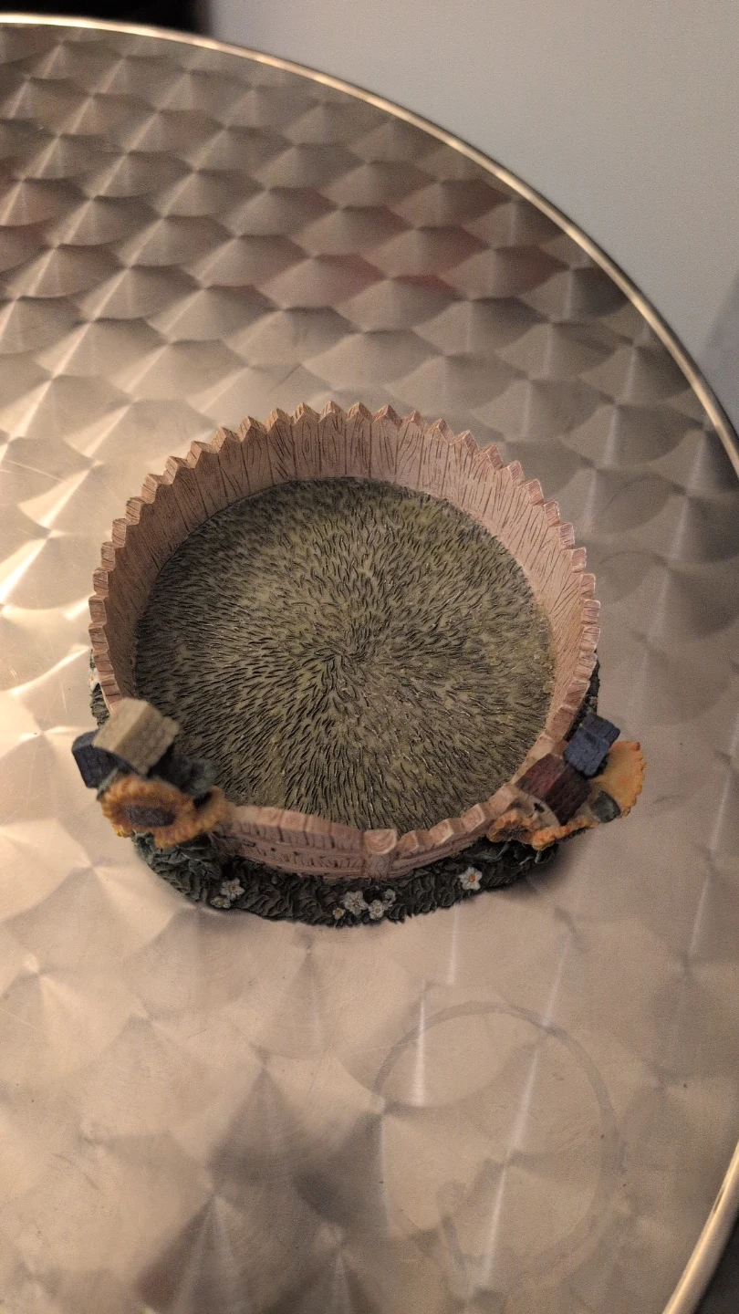 This charming trinket dish features a miniature farmhouse gate with sunflowers and tiny birdhouses. It's perfect for holding small jewellery or keepsakes. Made from resin, it has a rustic, decorative design.