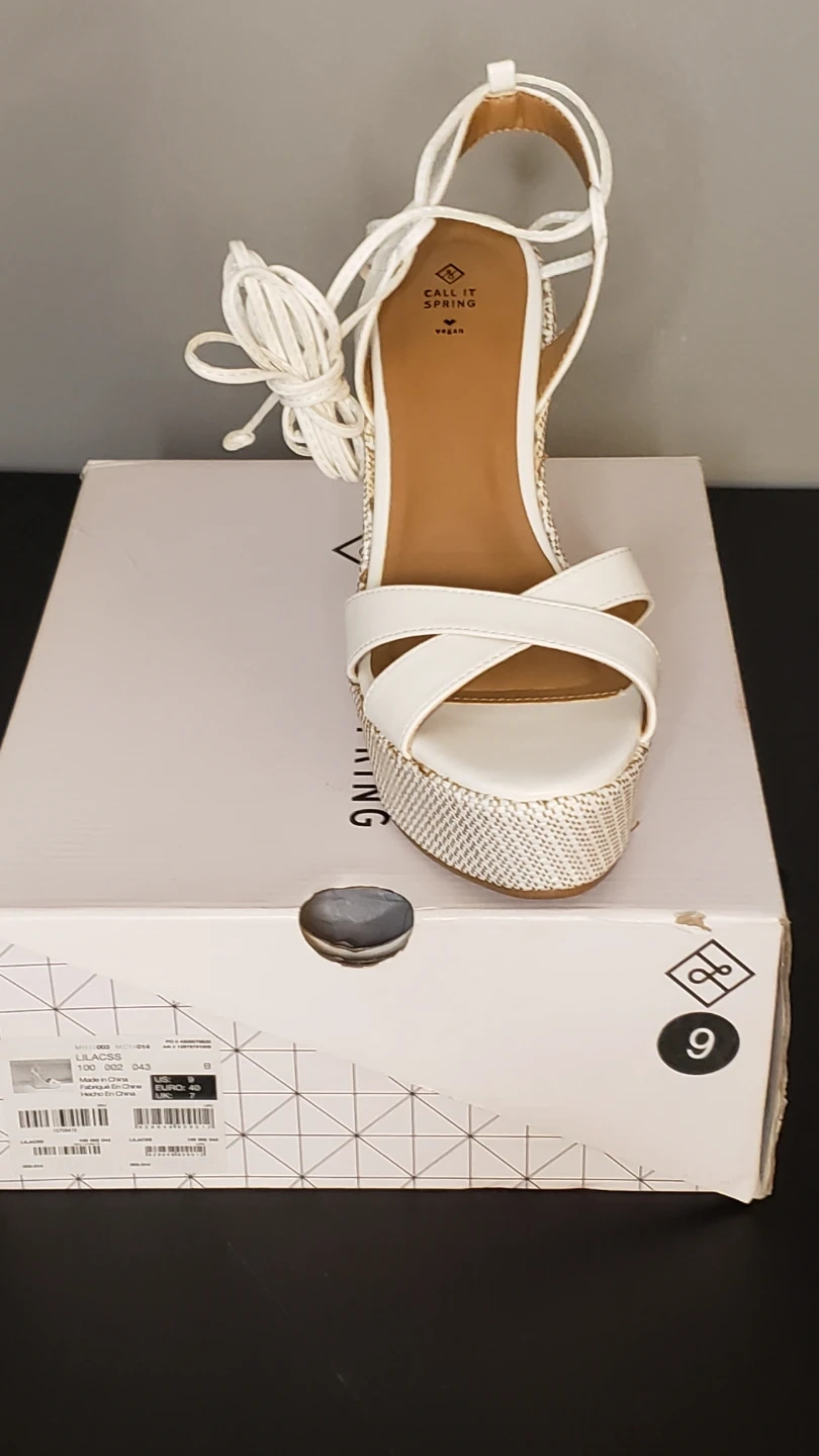 Selling a pair of Call It Spring, wedge sandals in white. They are a size 9 M. These stylish wedges come with their original box!