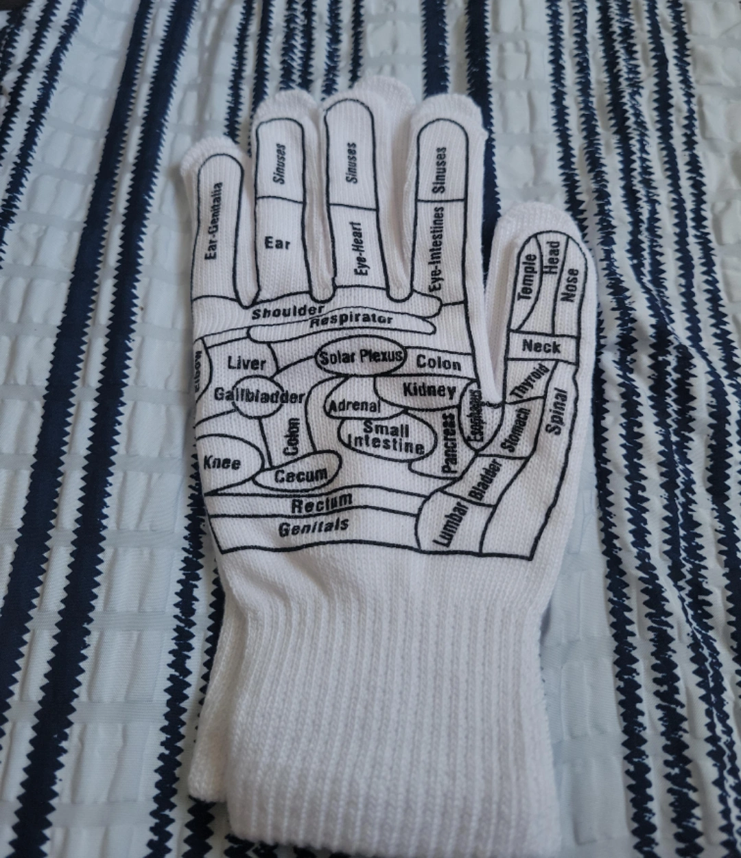 Selling a reflexology glove that indicates acupressure points on the hand. It's a unique item to explore alternative therapies!