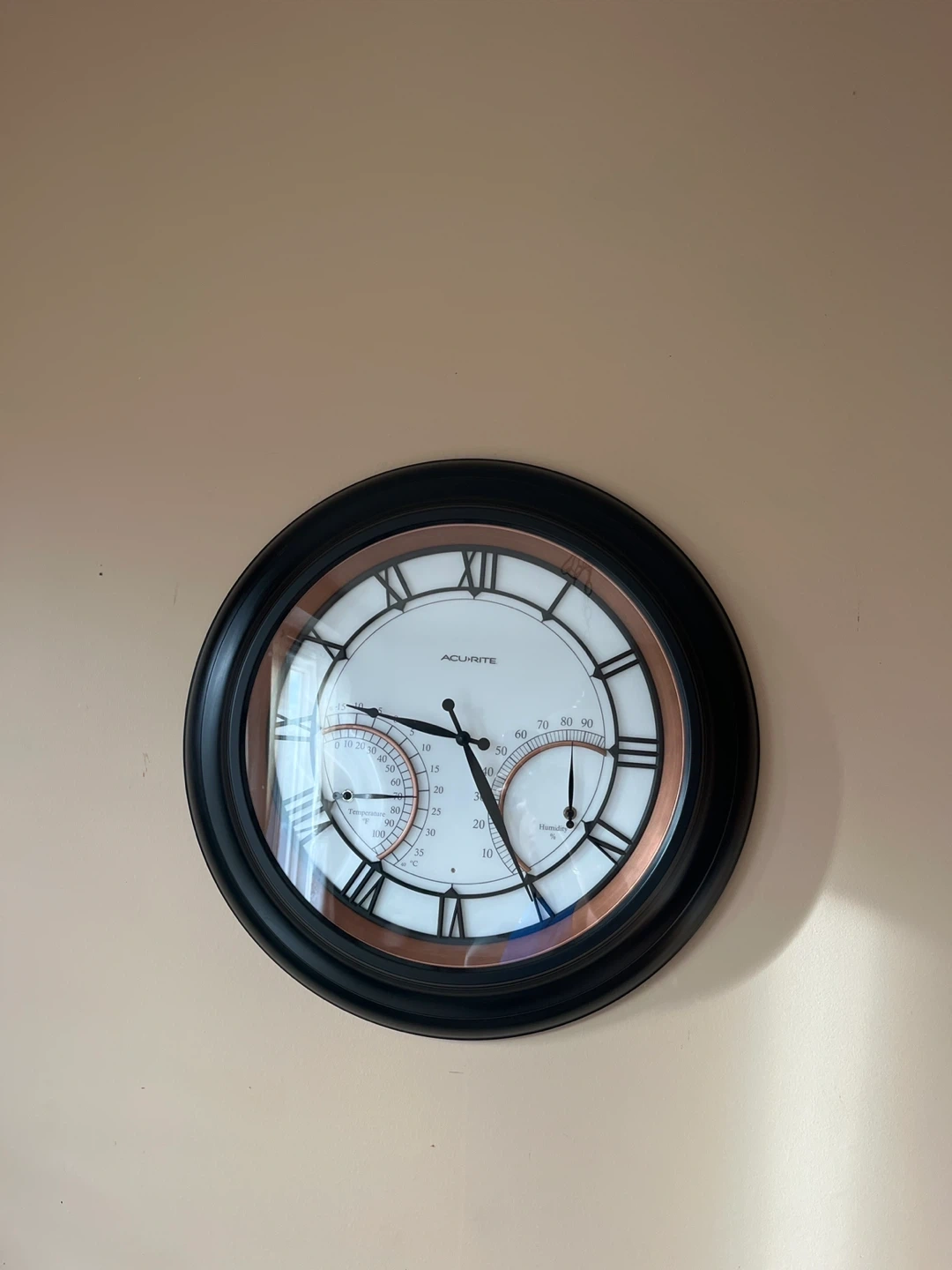 Selling an AcuRite wall clock that also measures indoor temperature and humidity. It has a classic design with Roman numerals and a black frame. Perfect for adding a touch of functionality and style to any room