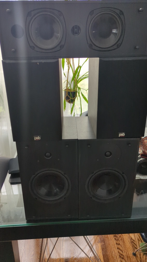 PSB surrounds and center are fine. Main drivers are shot but tweeter works fine. Sub took some damage in a move turns on and works sporadically so driver probably good, amp might be salvageable.