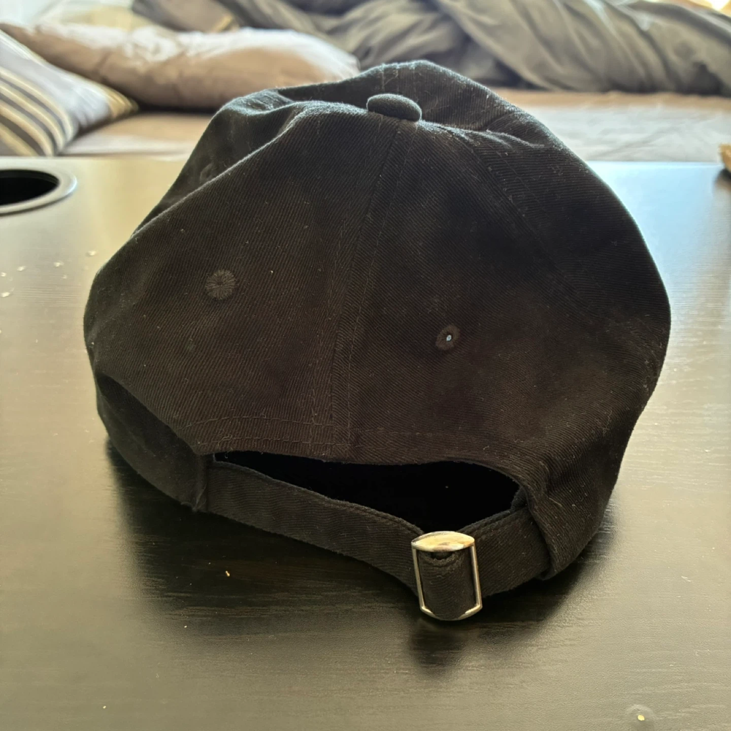 A black baseball cap featuring a classic Mickey Mouse design. It's made of durable fabric with an adjustable strap at the back for a comfortable fit. This cap is great for everyday wear and shows off your love for Disney!