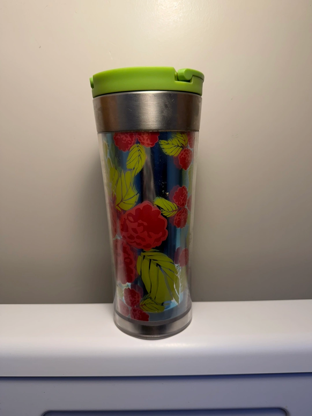 Vintage 2007 Starbucks travel mug with raised raspberry design. 16 oz capacity with plastic and steel lid. Great for Starbucks collectors or everyday use. Good condition and cleaned properly.
