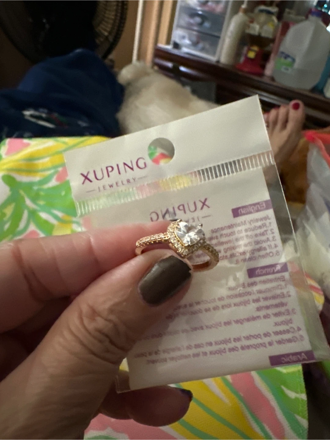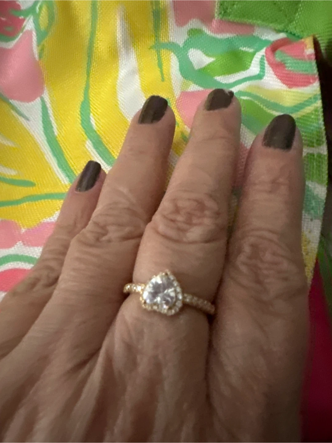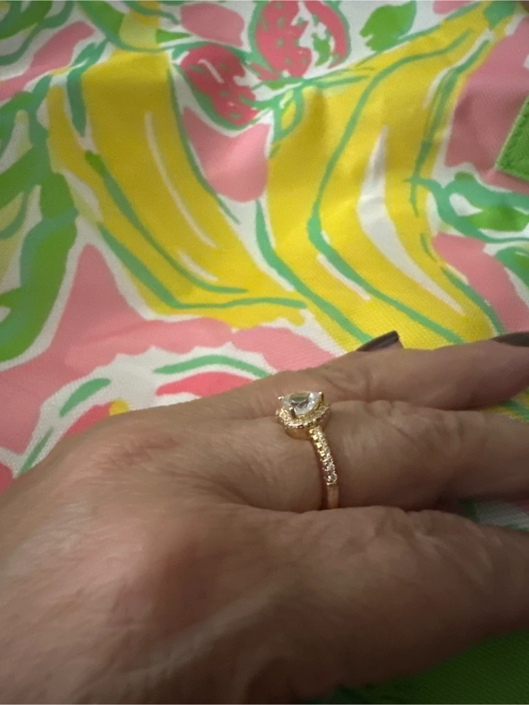 This ring features a pear-shaped centerpiece with smaller stones accenting the band. It's set in a gold-tone metal. This piece is ideal for adding a touch of sparkle to any outfit!