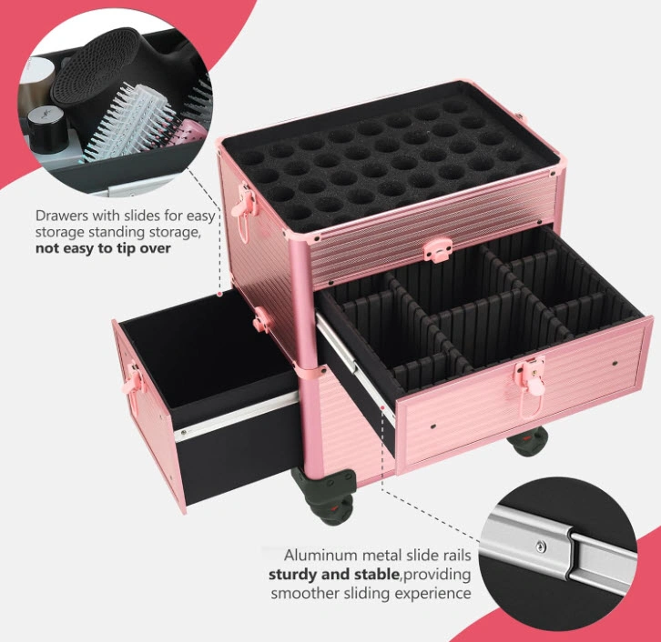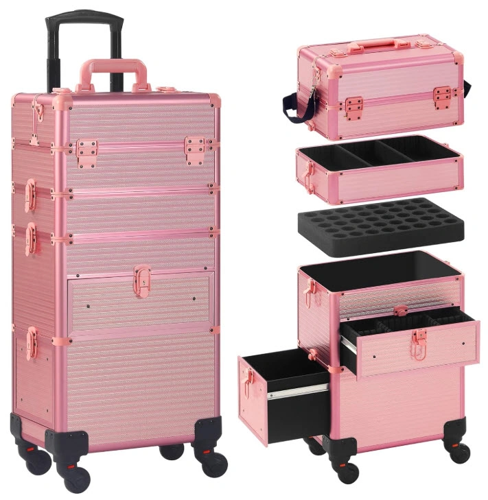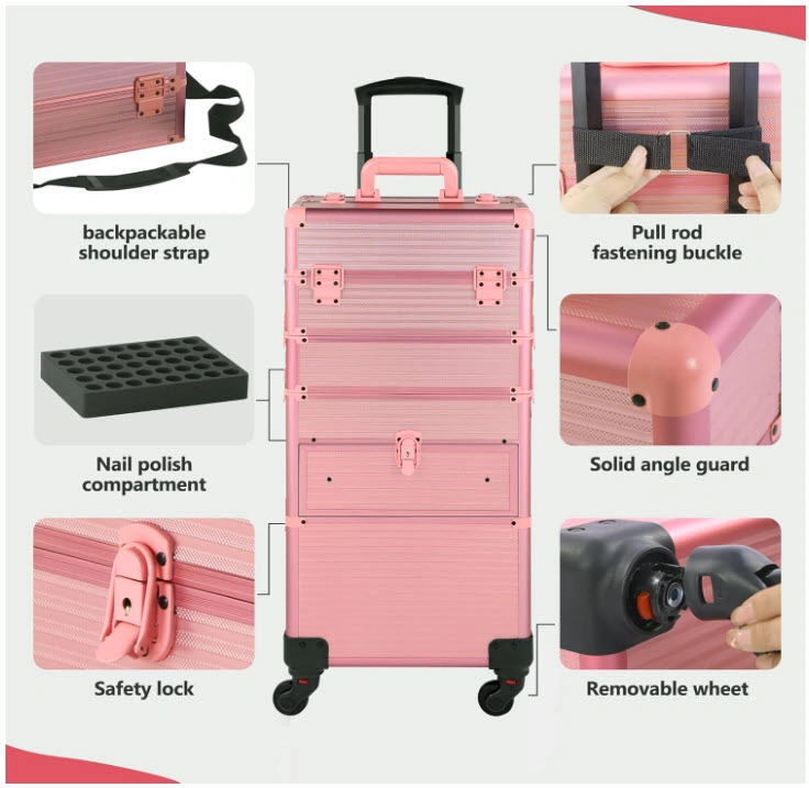 Large capacity rolling makeup case. Features multiple compartments, drawers, and a nail polish holder. Includes a shoulder strap and removable wheels. Durable aluminum construction.