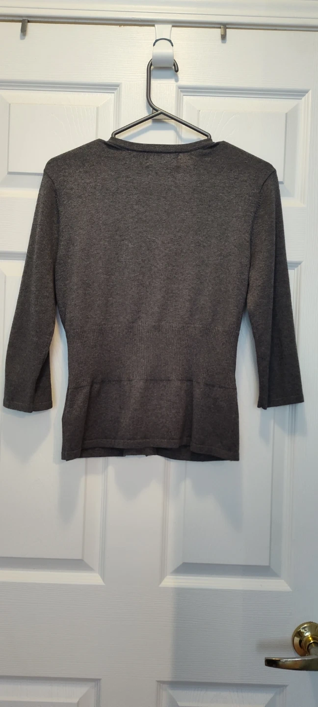 A charcoal grey Kersh cardigan with a V-neck and button closure. It's made of 81% cotton, 19% spandex. This sweater is great for layering over outfits.