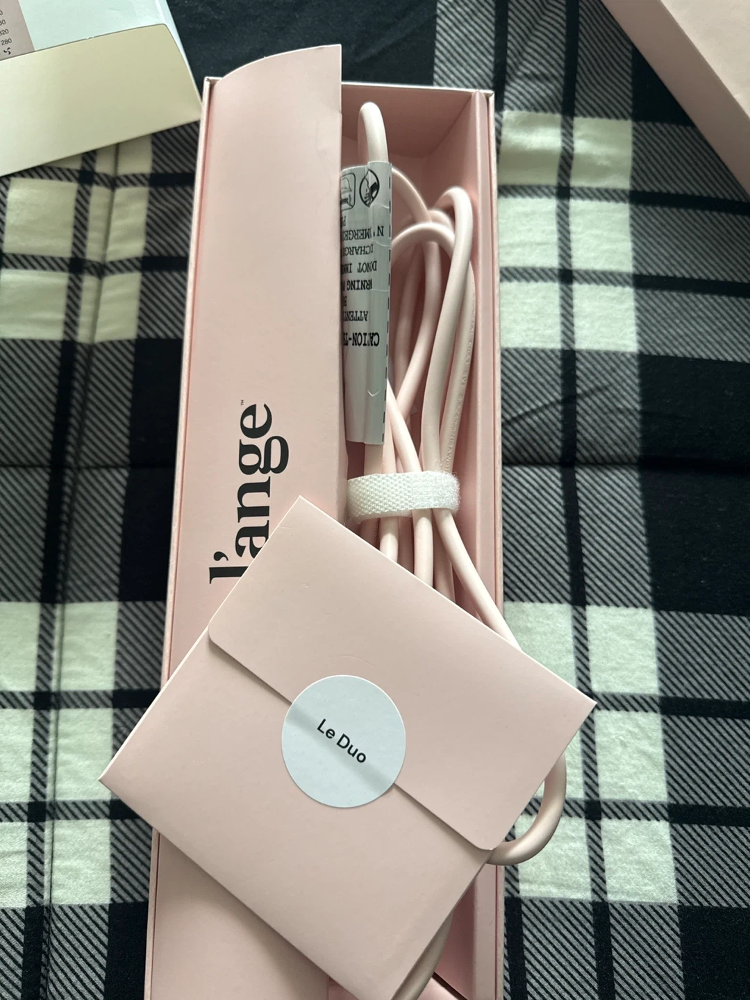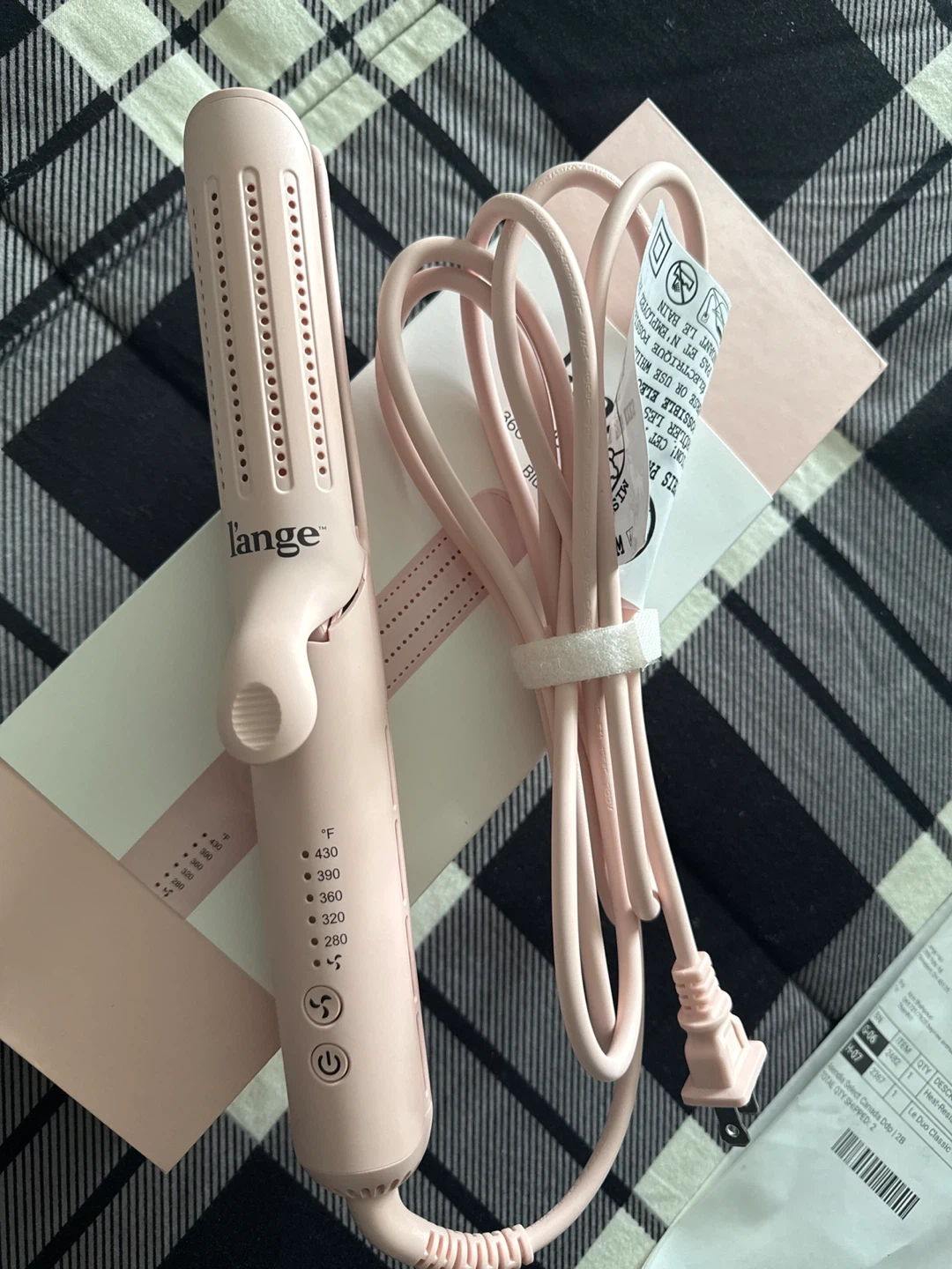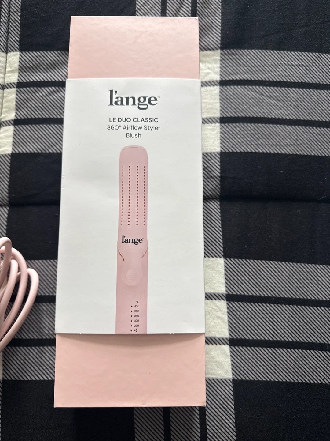 This is the L'ange Le Duo Classic 360° Airflow Styler in blush pink. It features adjustable temperature settings up to 430°F. It also comes with its original box and pouch. This styler is great for creating smooth, sleek hair quickly!