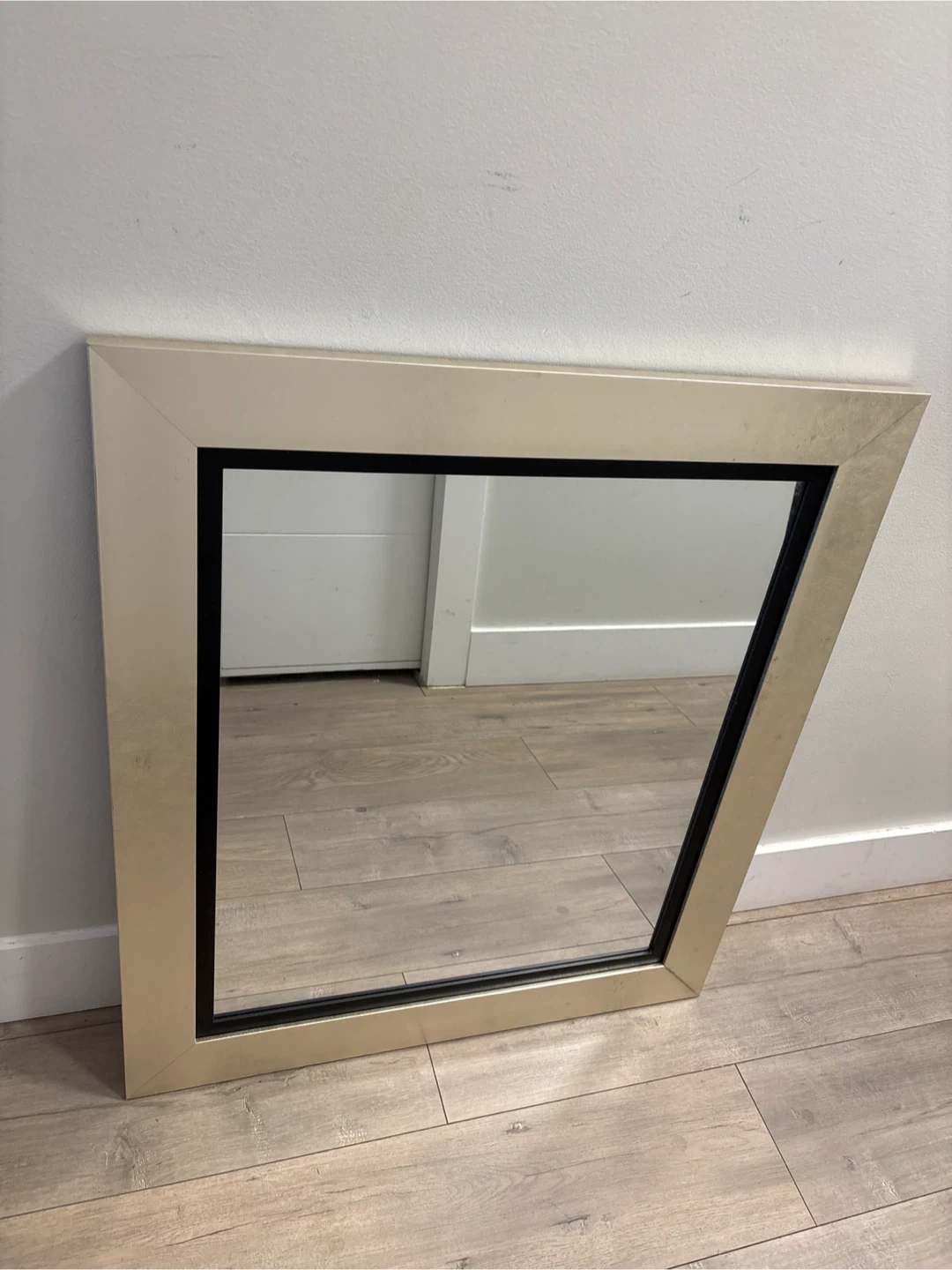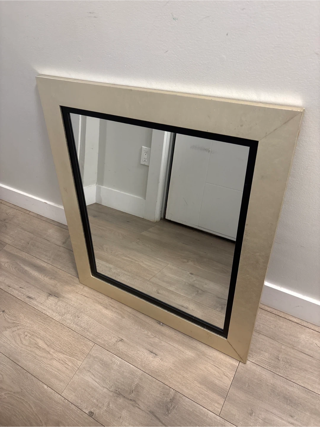 A stylish mirror with a gold-toned frame and a black inner trim. It's perfect for adding a touch of elegance to any room.