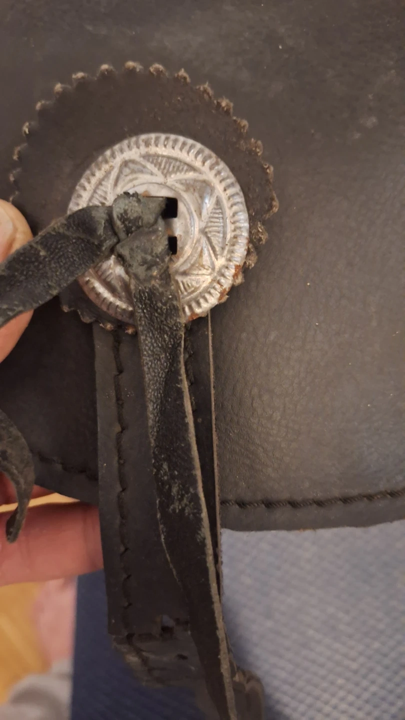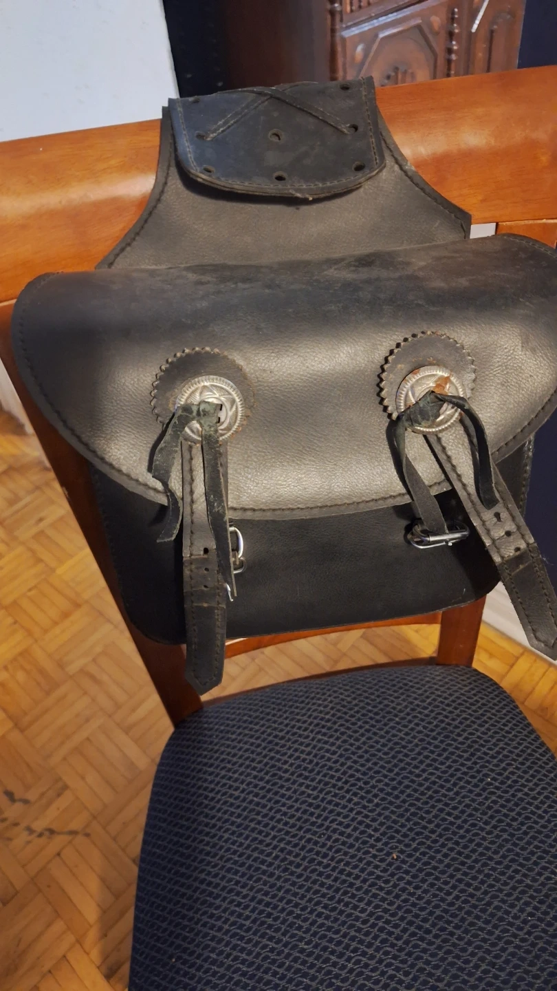 These are black leather saddlebags for a motorcycle. They're made of durable leather and feature decorative concho details. Straps for attachment are included.