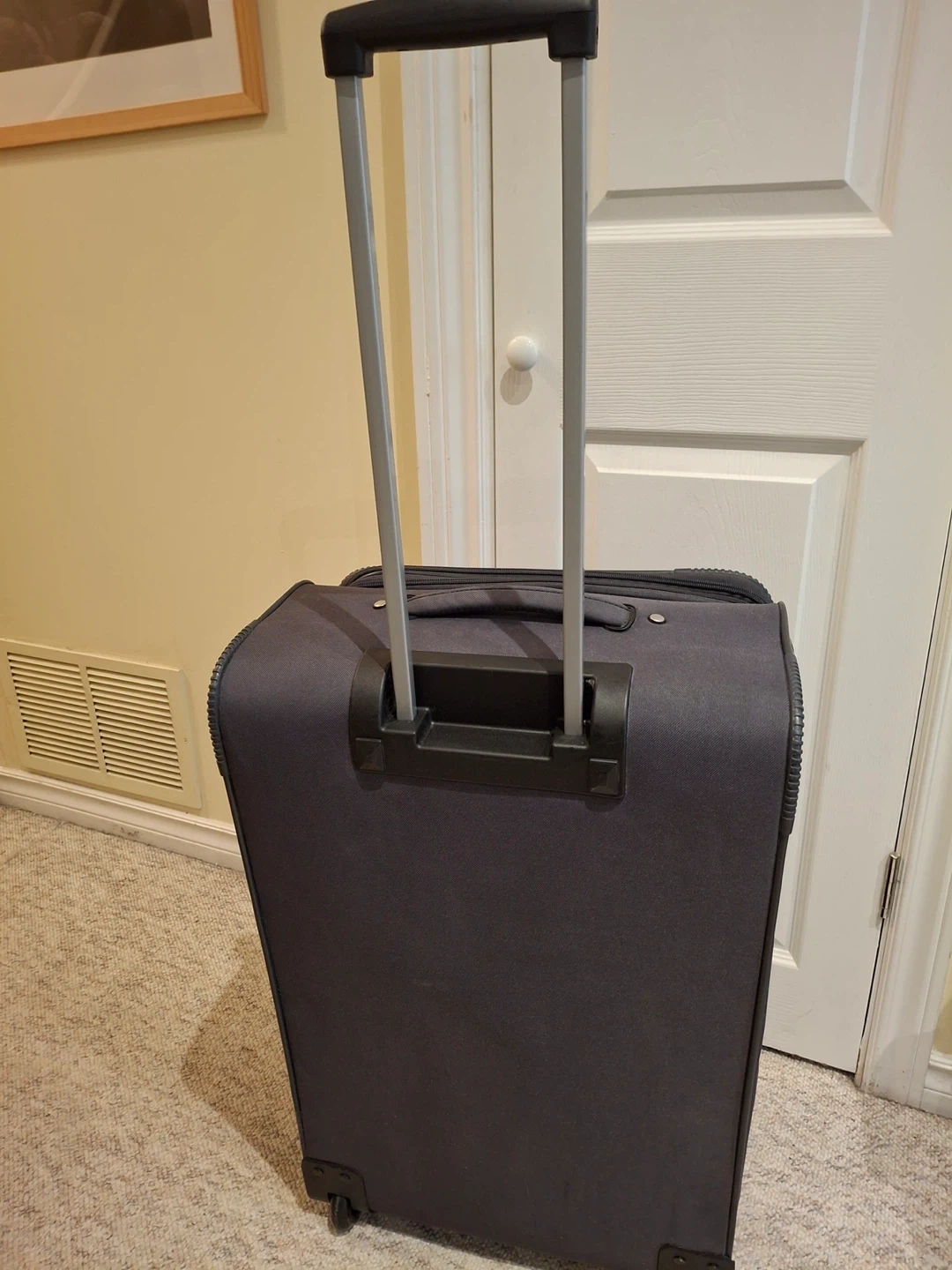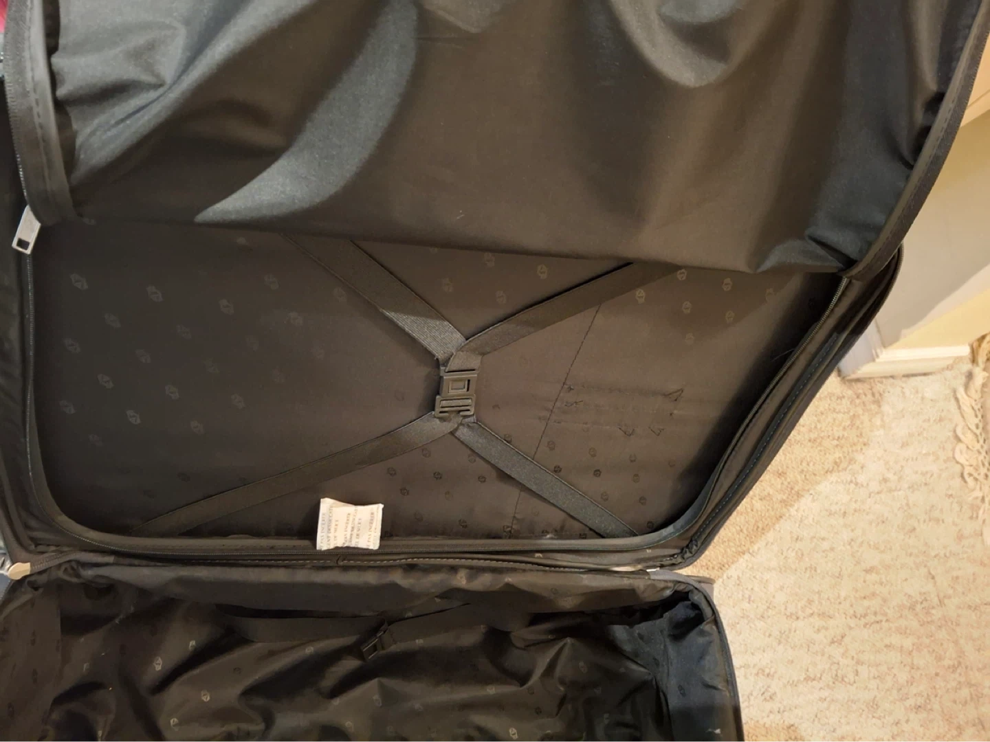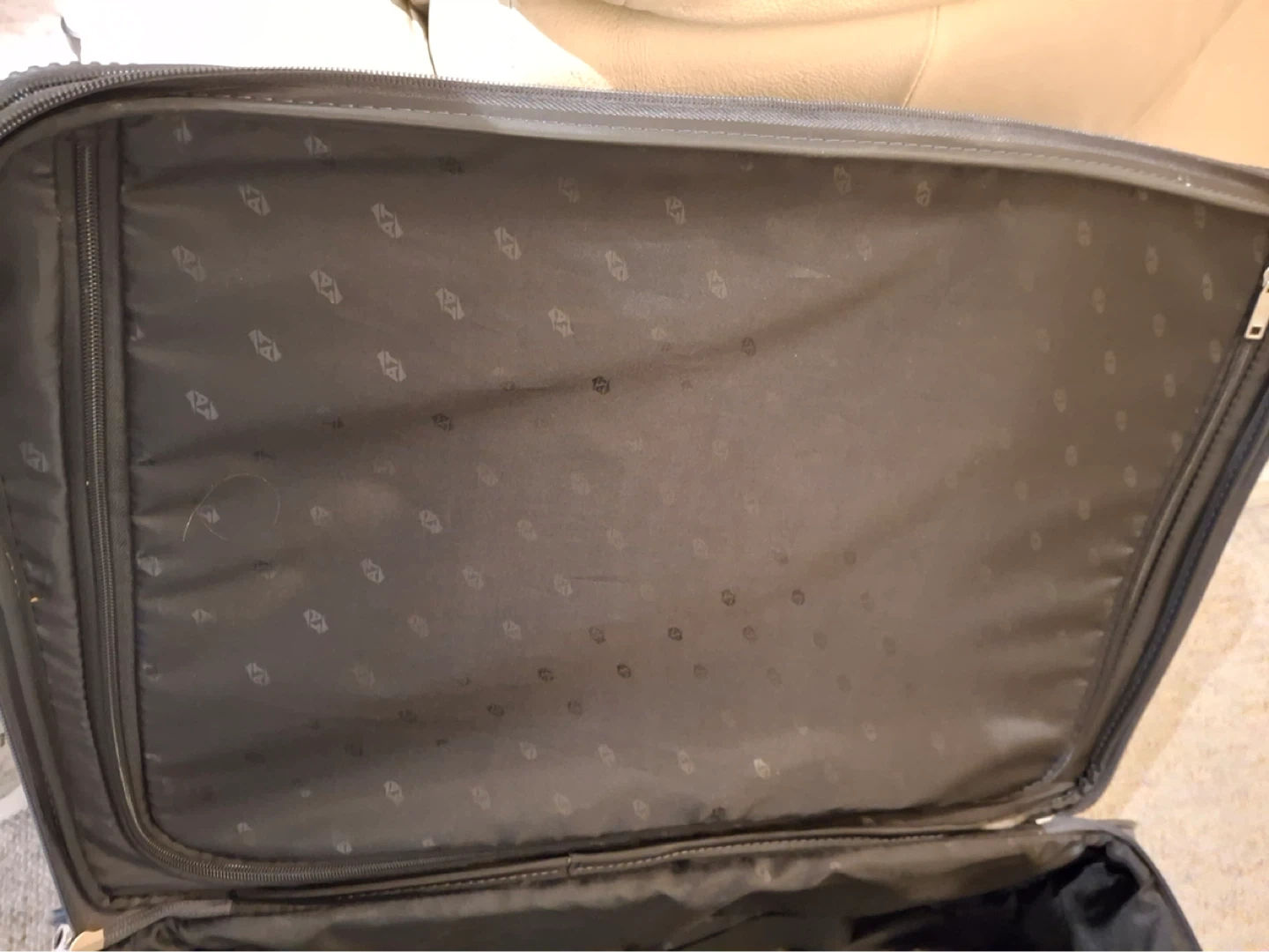 American Tourister suitcase, 26” to base by 16” across, 10” deep from front to back. Condition is like brand new (likely only used once). Zippered outside pockets, inside zippered section and straps.