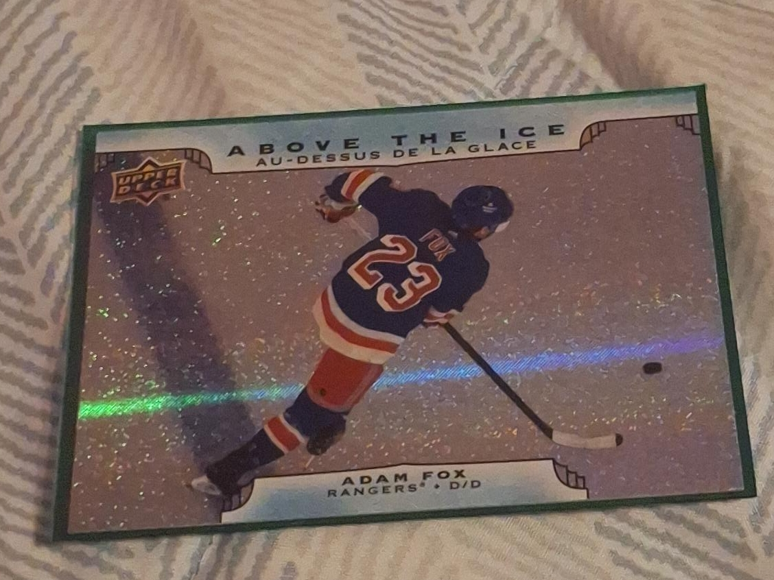 91Selling an Adam Fox Upper Deck hockey card. It's from the 'Above the Ice / Au-dessus de la glace' series and features Adam Fox of the Rangers. A great addition for any hockey card collector!
