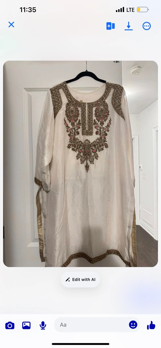 Beautiful white3 piece dress with intricate gold and pink embroidery on the neckline and hem. Made from a silky fabric. Perfect for special occasions!