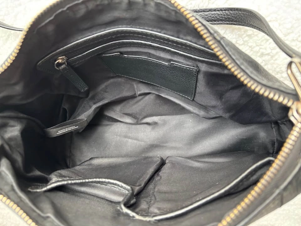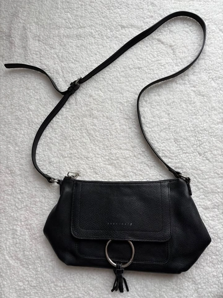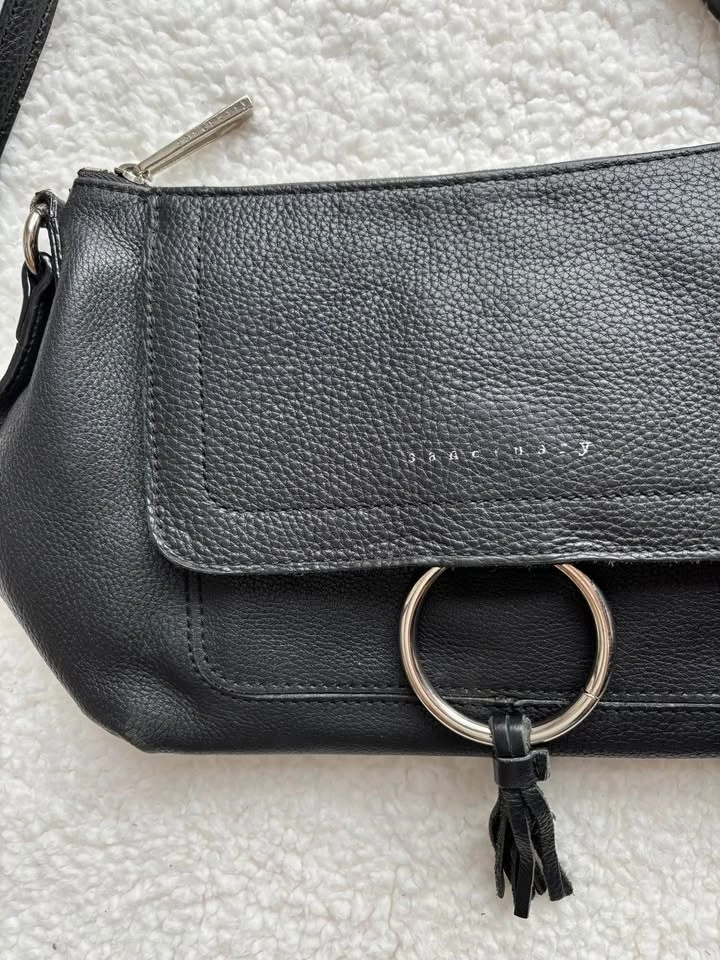 Elegant Sanctuary black soft leather shoulder bag with a stylish ring detail. In pristine condition. Approximately 12x7 inches with lots of pockets to store your things and a long adjustable strap measuring 22-29 inch drop.