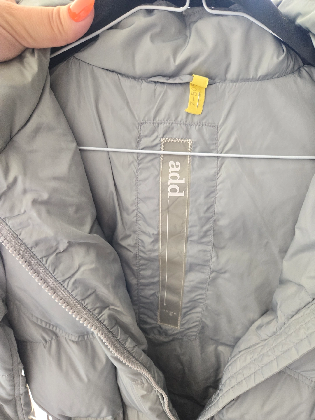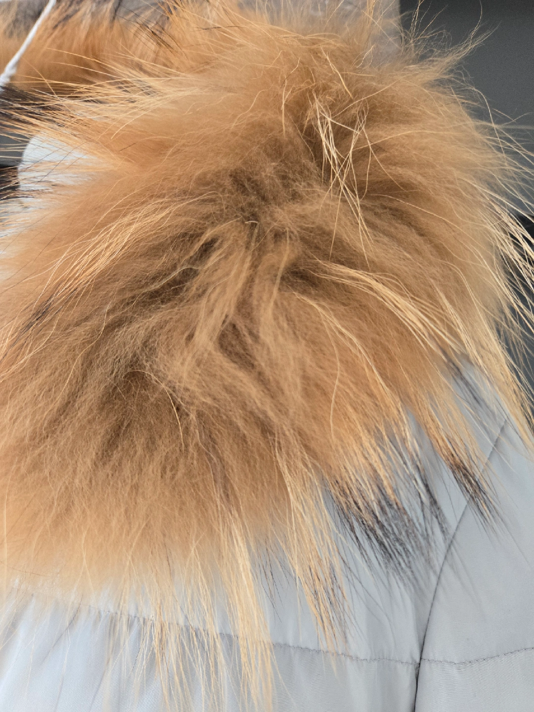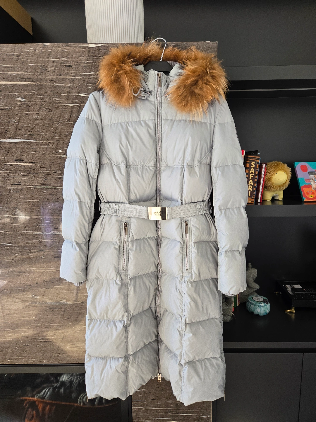 205Selling a stylish ADD down puffer coat in light grey. It features a cozy fur hood and a belted waist for a flattering silhouette. Perfect for staying warm and fashionable during the colder months!