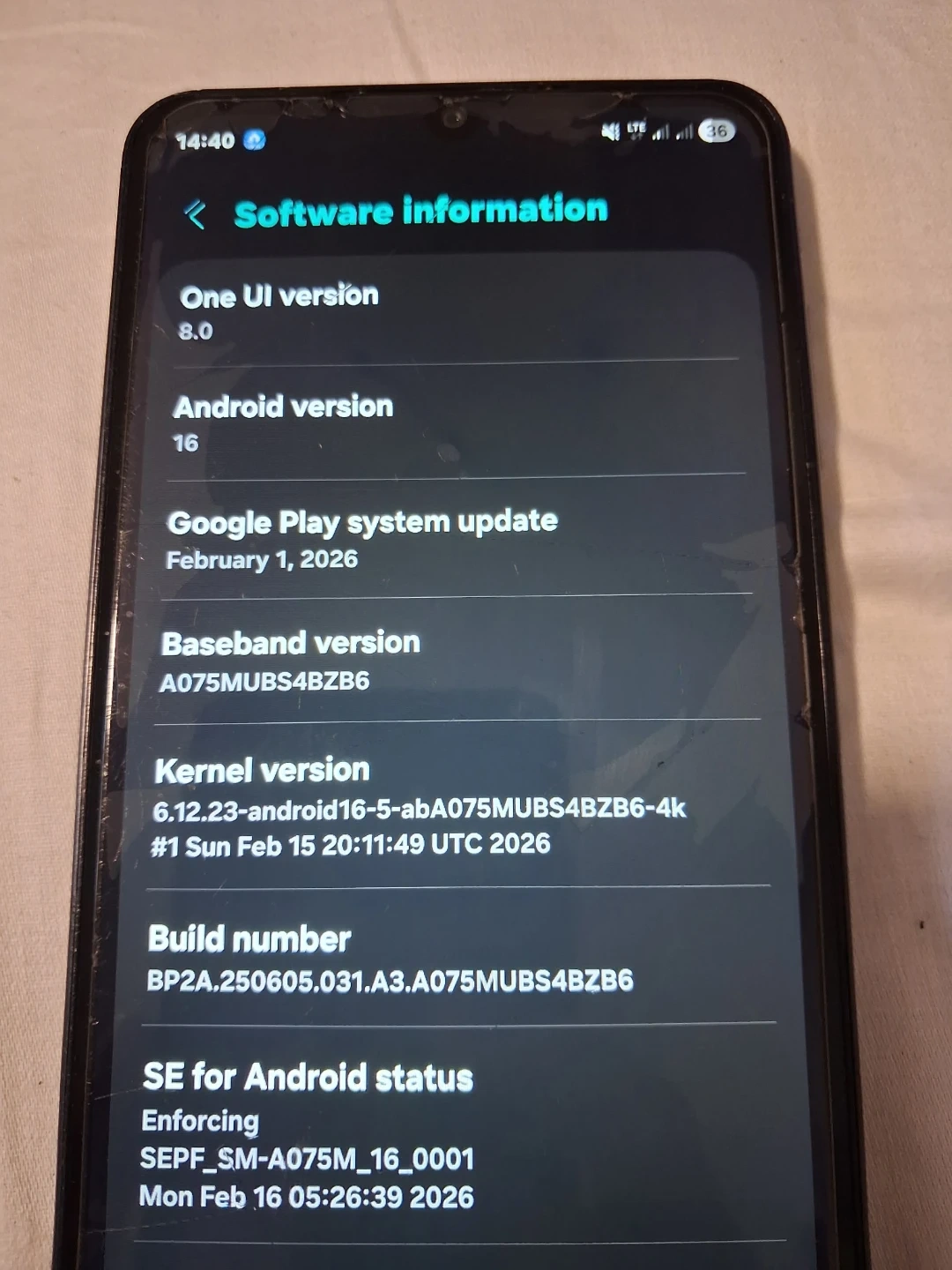 This is a Samsung Galaxy A07 smartphone. It runs on Android version 16 with Samsung's One UI version 8.0. The Google Play system update is from February 1, 2026. It's a great device for everyday use! Has a screen protector on it and has zero damage to the screen, only minimal damage to the screen protector.