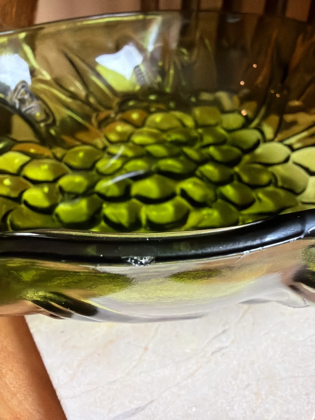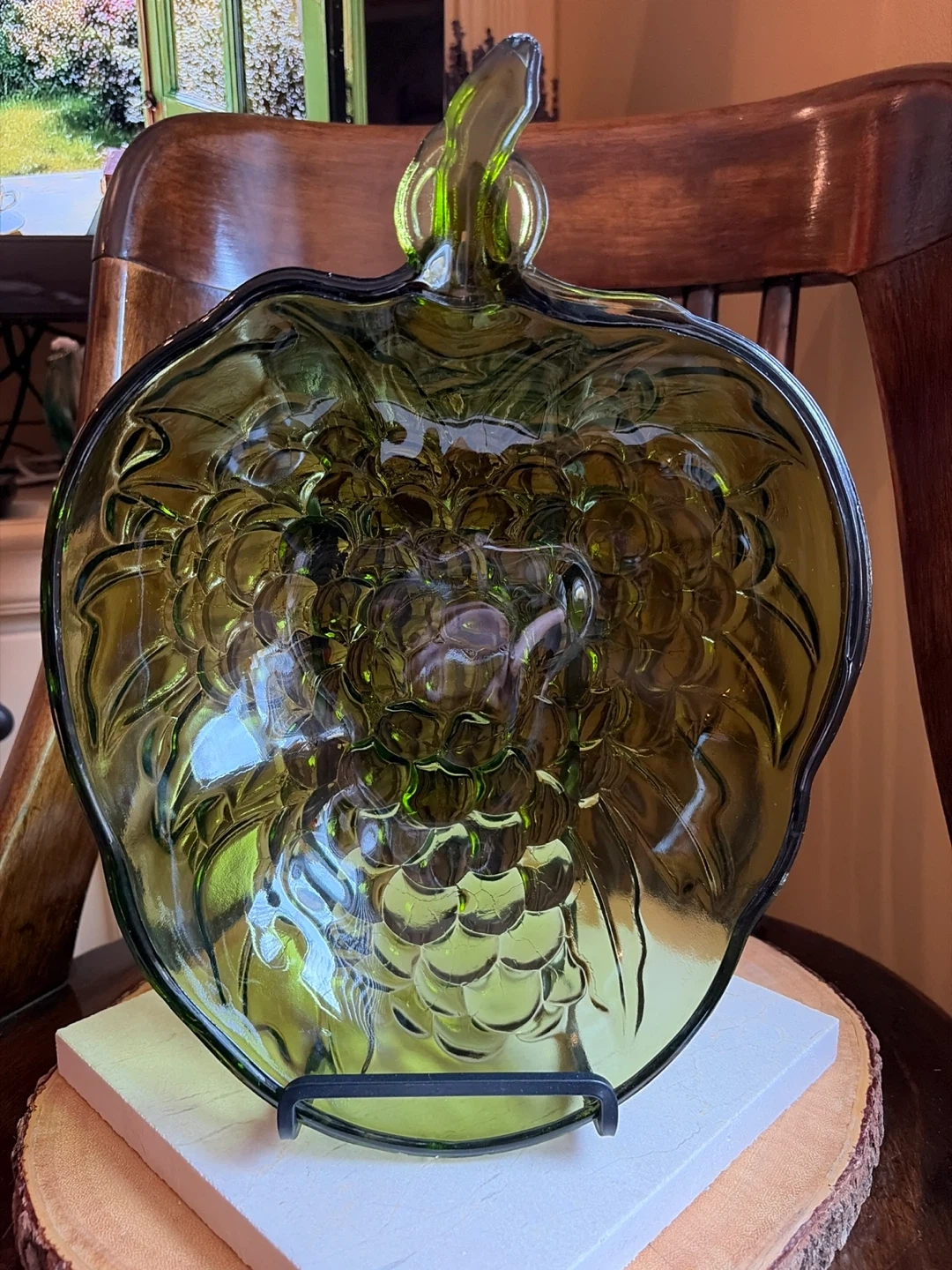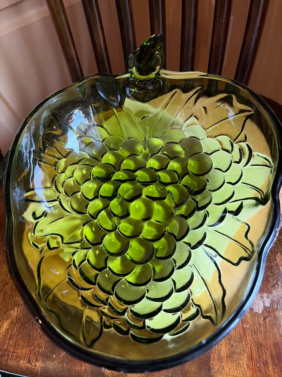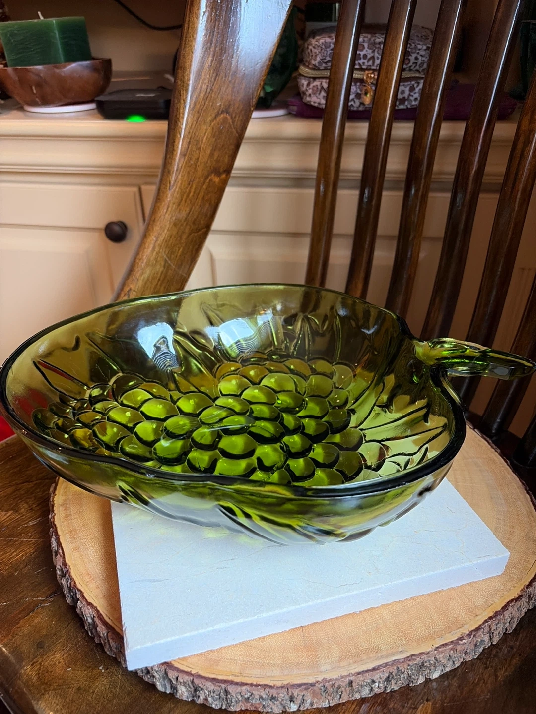 This beautiful vintage Indiana glass serving bowl features a charming grape cluster shape and design embossed on the interior. It's made of a sturdy avocado green glass and shaped like a leaf with a stem handle. It is made in the 1970’s so there are a few tiny flea bites but otherwise in great condition (see pics). It is 13” from stem to bottom and 9” wide at the widest area and about 3” tall. It's perfect for serving salads, as a fruit bowl or as a decorative centrepiece!