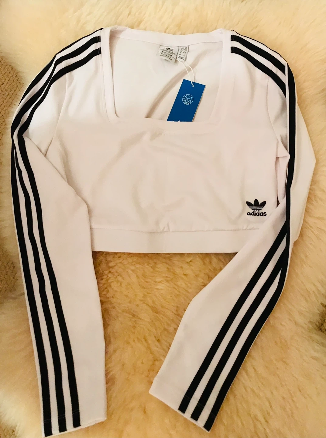 26Selling a brand new Adidas Adicolor Classics Long Sleeve cropped Top in size medium! It's white with the classic black Adidas stripes on the sleeves. Perfect for a sporty and stylish look.