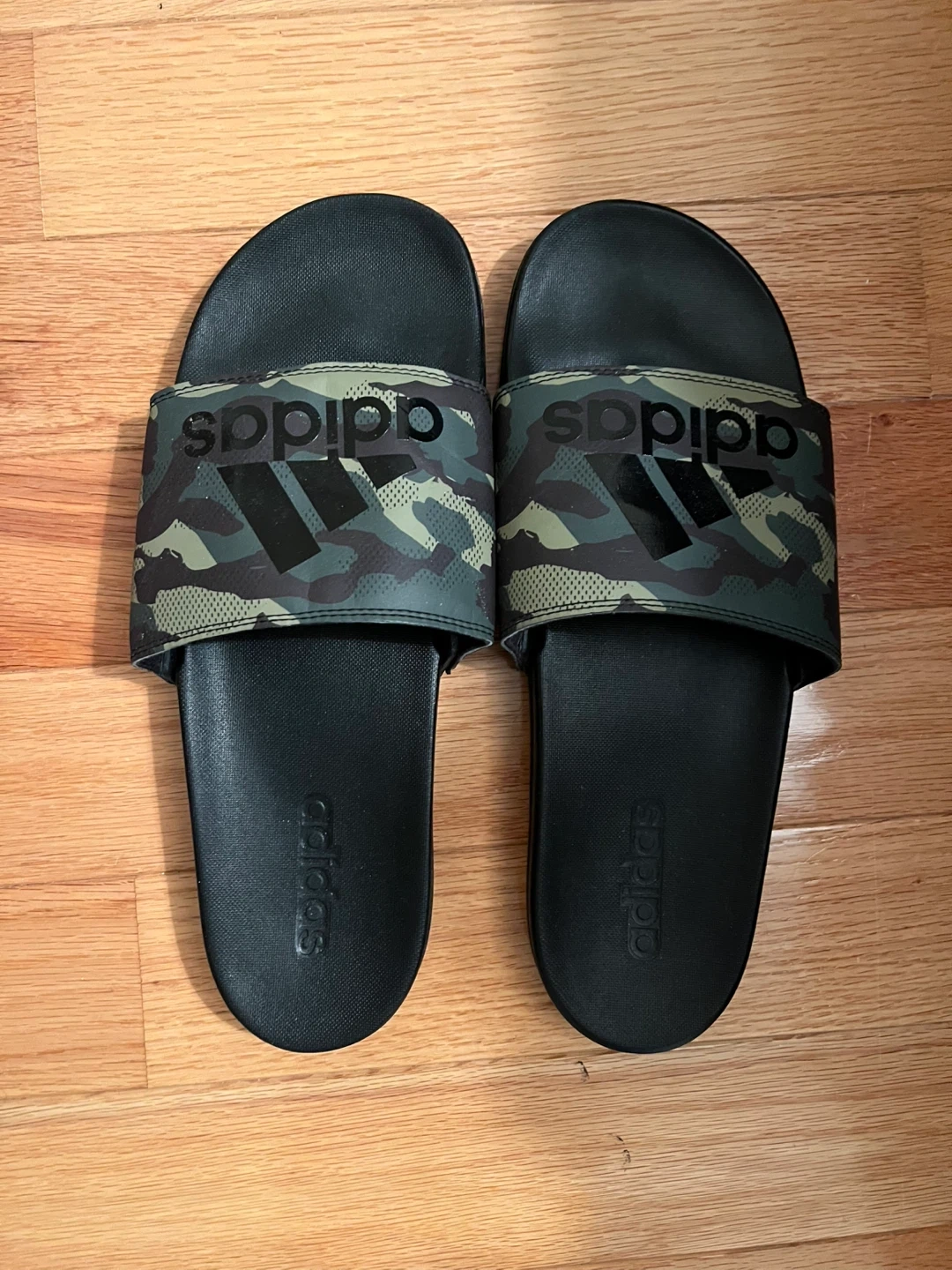 Adidas Adilette slides in a cool camo pattern! These are super comfy and perfect for wearing around the house or to the beach. They have the Adidas logo on the strap and footbed.