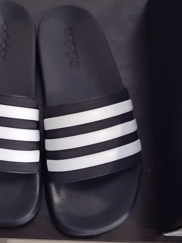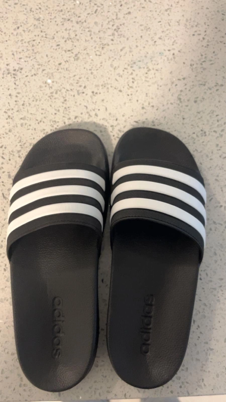 Selling a pair of Adidas slides in size 4 youth. They're black with the classic white stripes. These slides are super comfortable and great for everyday wear!