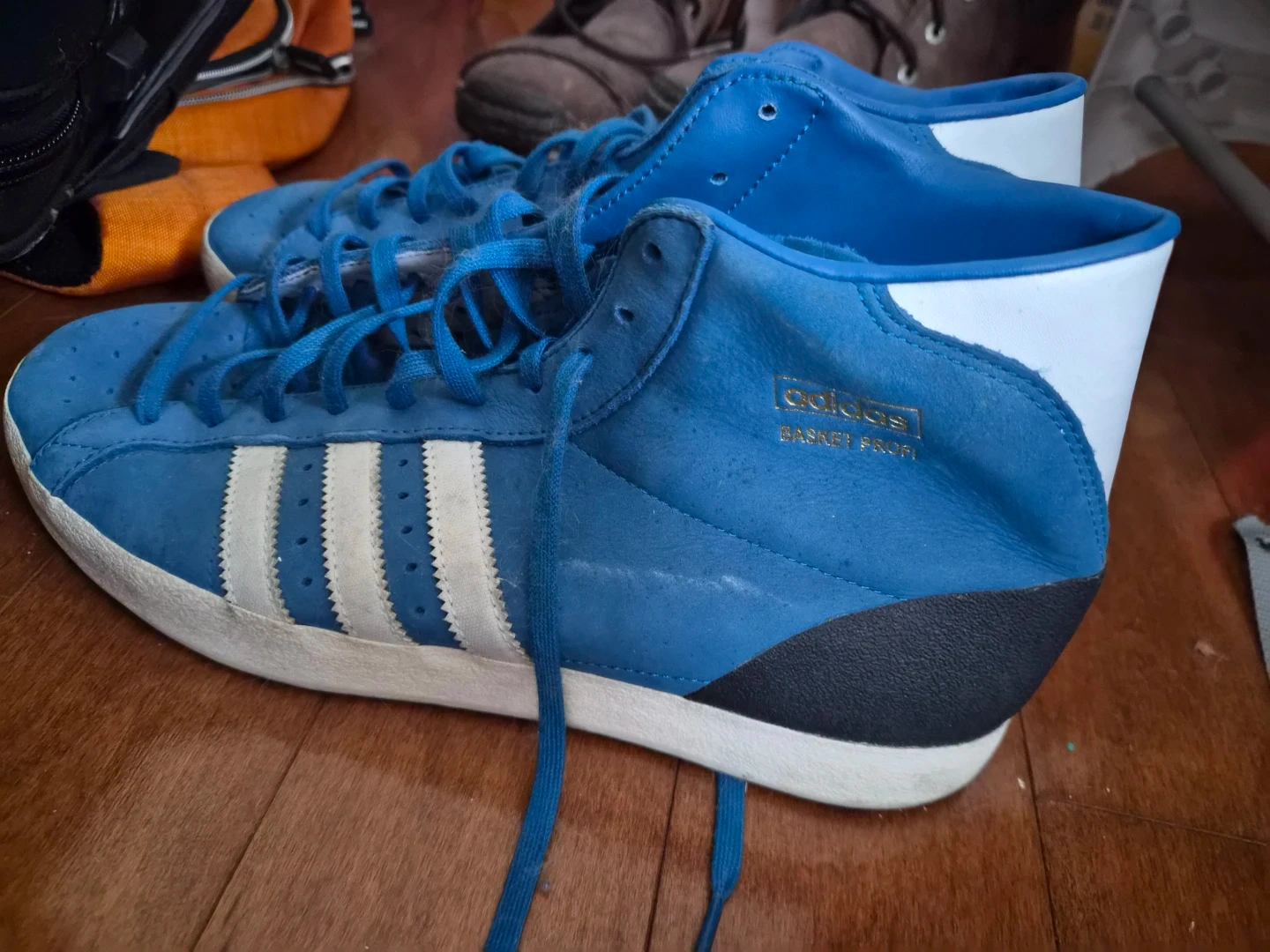 53Selling a pair of Adidas Basket Profi high-top sneakers in blue. They have the classic Adidas three-stripe design in white. size 10