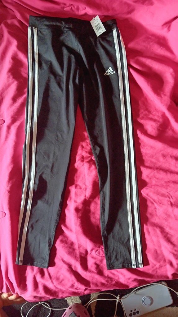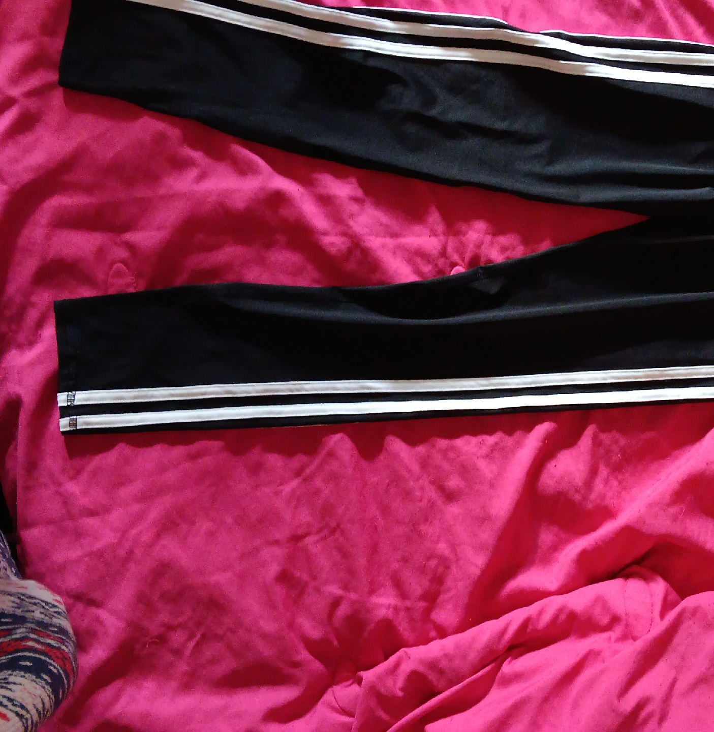 Selling a pair of Adidas black track pants featuring the classic white stripes down the sides. These pants are in great condition and perfect for workouts or casual wear. The Adidas logo is visible. They're a stylish and comfortable addition to any wardrobe!