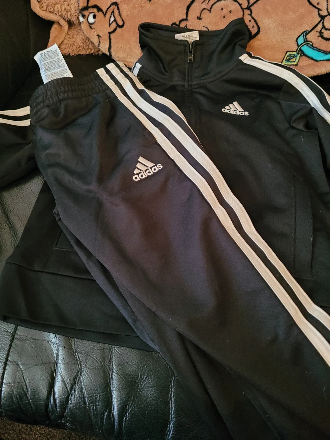 5Selling an Adidas tracksuit set! It's black with the classic white stripes down the sides of both the jacket and pants. Great for sports or just lounging around!