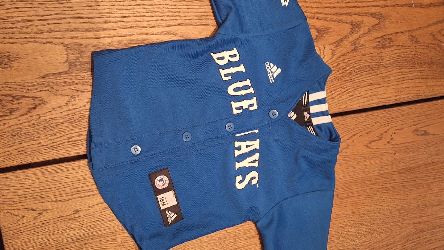 Check out this adorable Adidas Blue Jays baseball jersey! It's in excellent condition and sized for 18-month-olds. Perfect for your little Blue Jays fan!