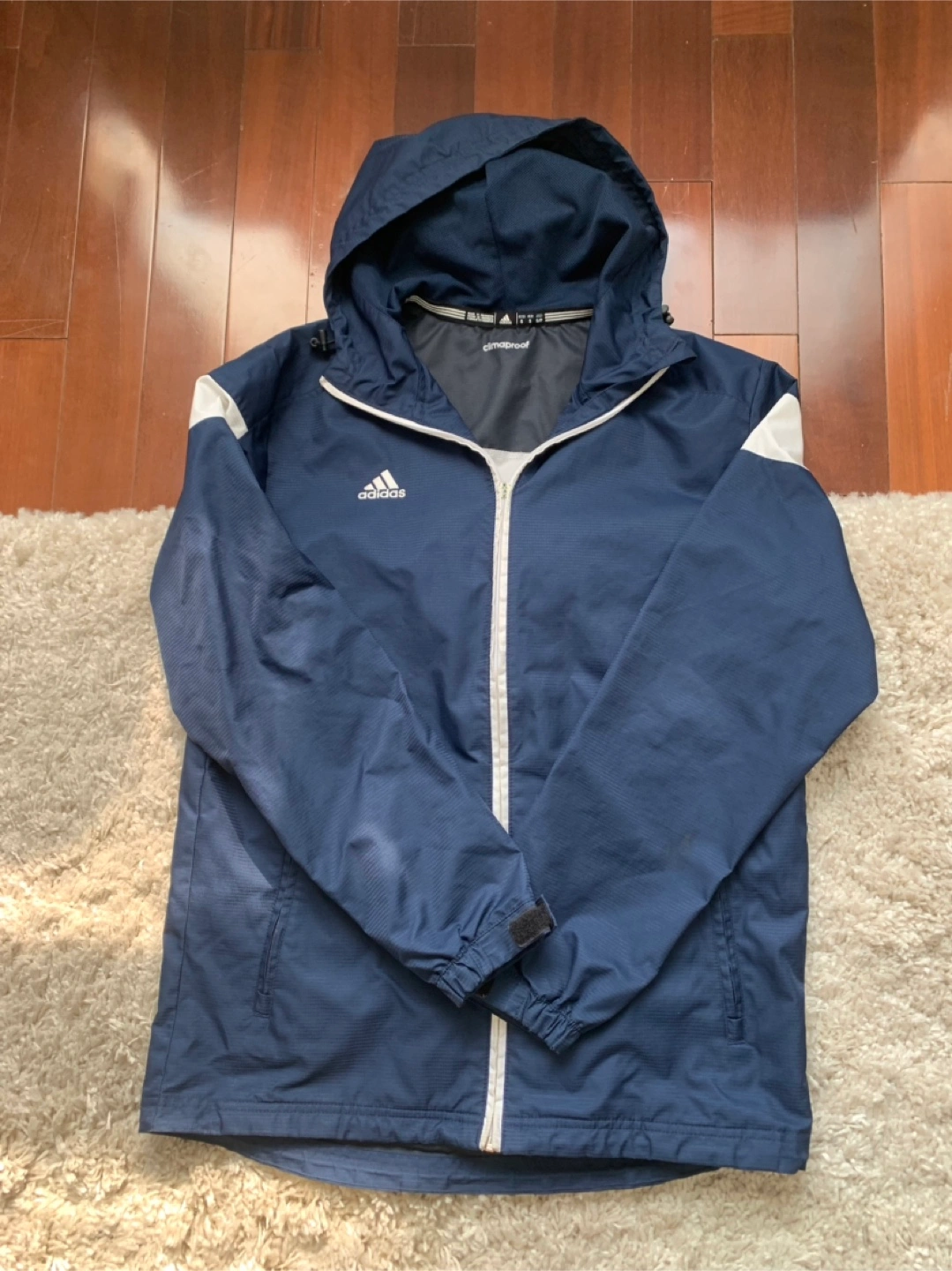 90Selling an Adidas ClimaProof jacket in navy blue. It's in great condition and features a hood and zipper pockets. Perfect for outdoor activities! Broken zipper other than that good condition