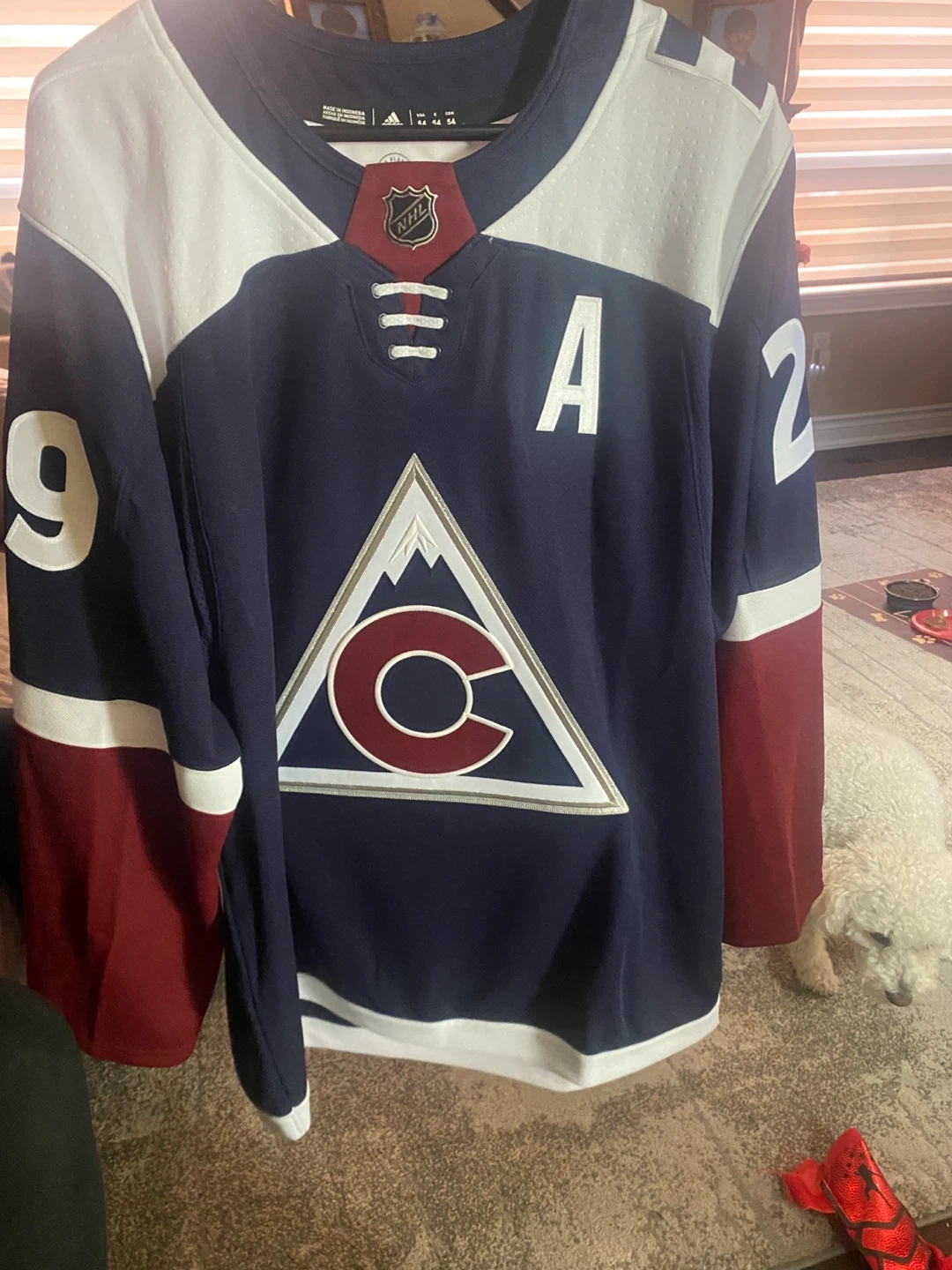 Selling an Adidas Colorado Avalanche jersey, featuring MacKinnon's #29! The jersey is navy, white, and burgundy. It has the Avalanche logo on the front and the Adidas logo on the back. A great jersey for any Avs fan!