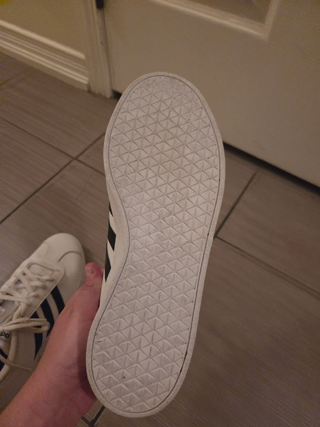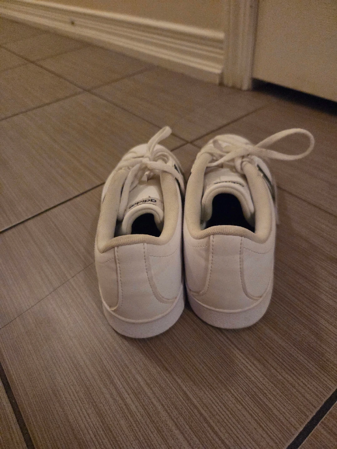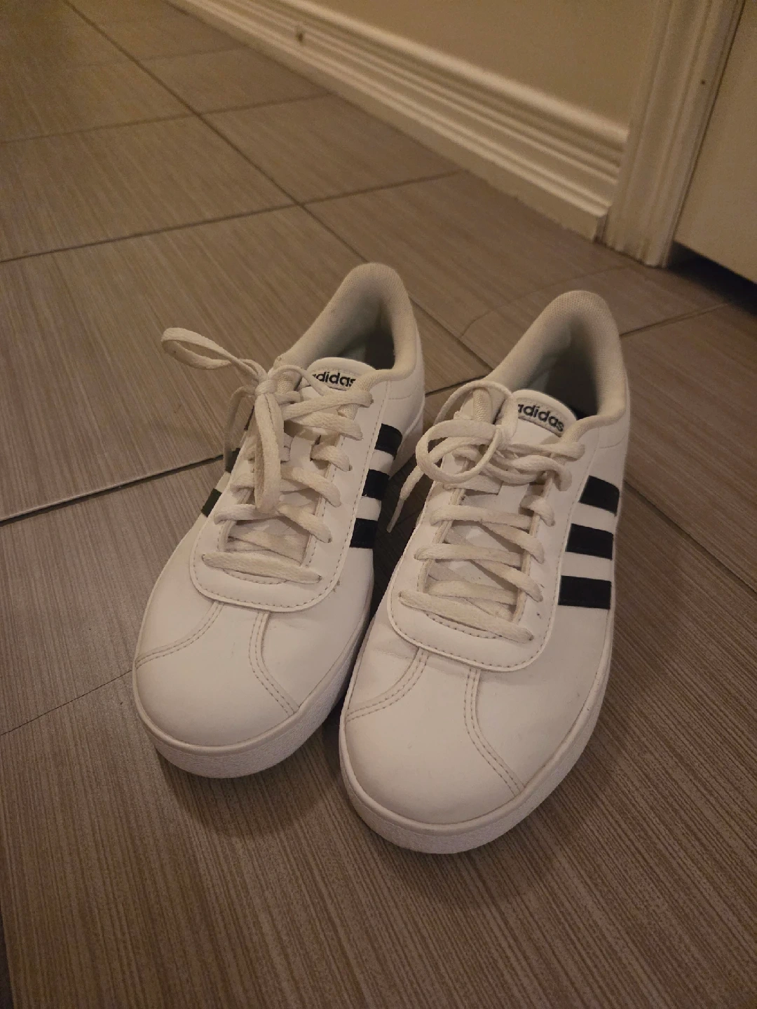 15Selling a pair of Adidas Courtset sneakers in women's size 7. They're white with black stripes. The size is US 7, UK 5.5, FR 38 2/3, JP 240, CHN 235. They are in great condition!