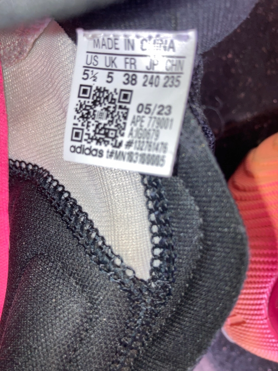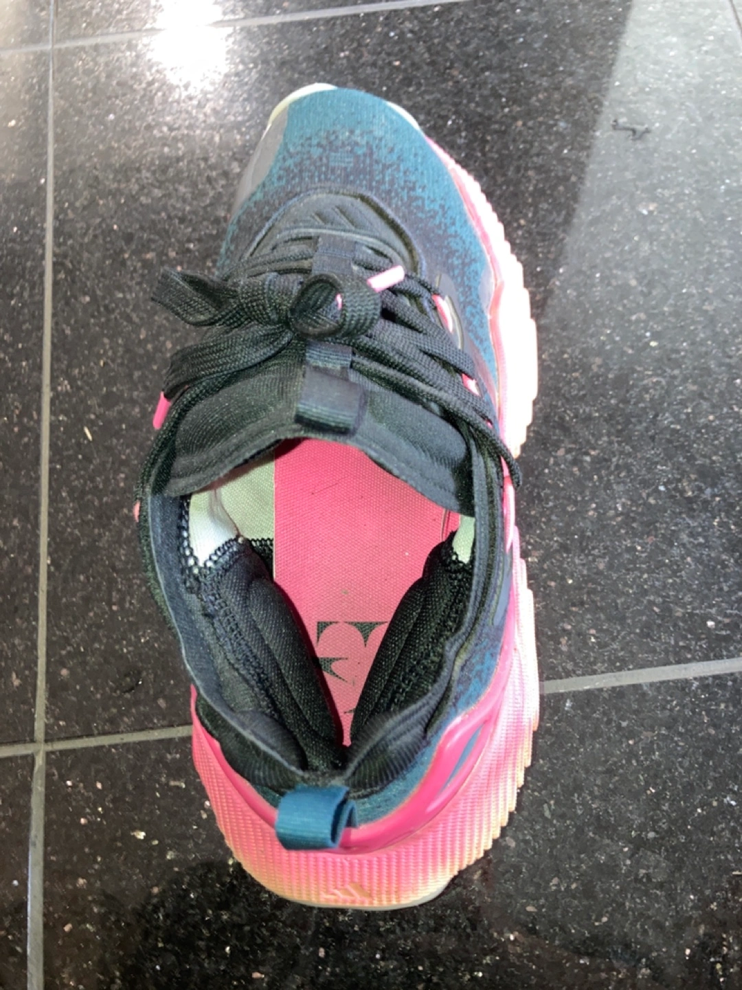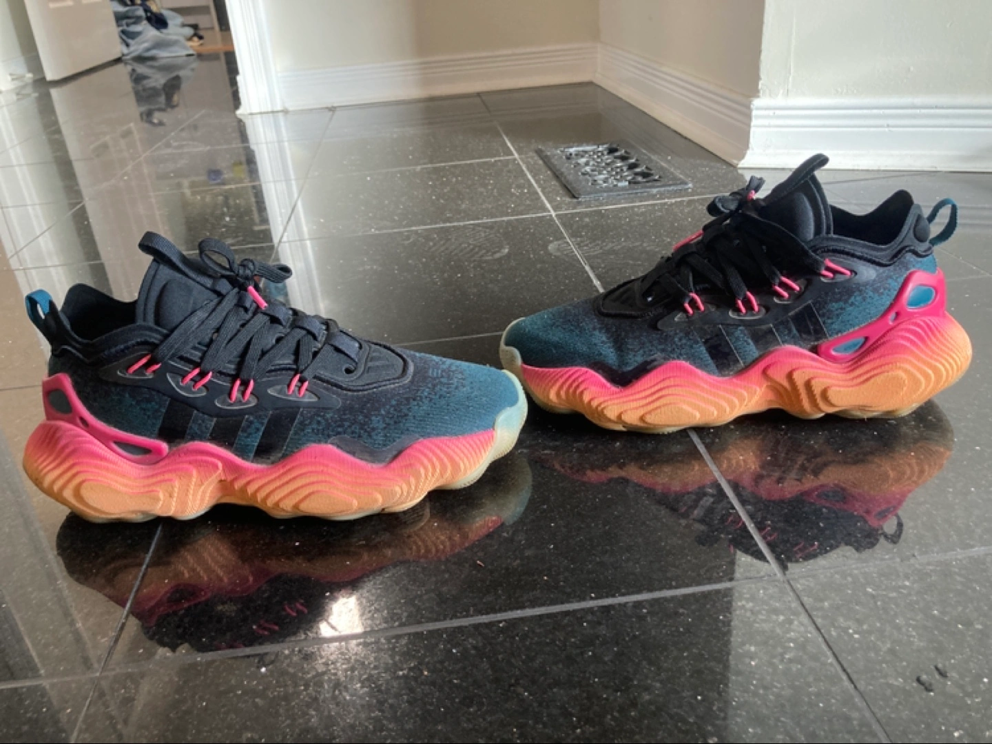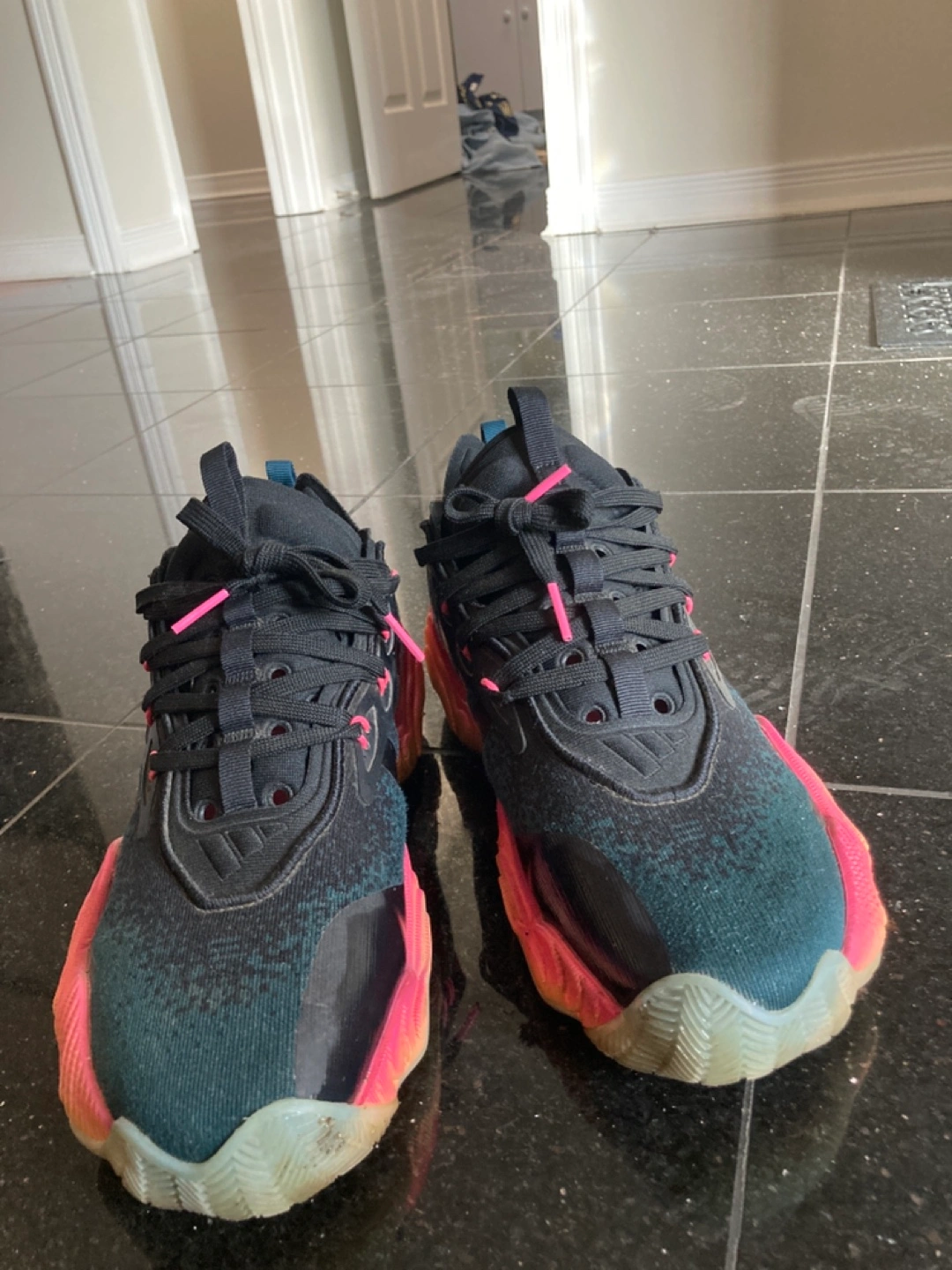 Adidas Dame 10 basketball shoes. Black, teal, and pink colourway. Unique wavy outsole. Minimal wear.