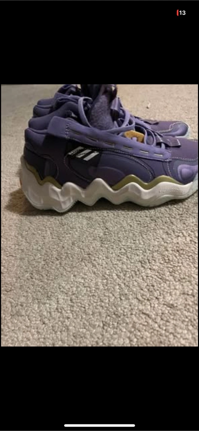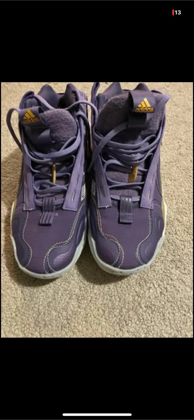 10Selling a pair of Adidas Exhibit B Wmns Mid basketball shoes in size 7.5. They are purple and in great condition. The shoes have a unique design and are perfect for basketball or casual wear!