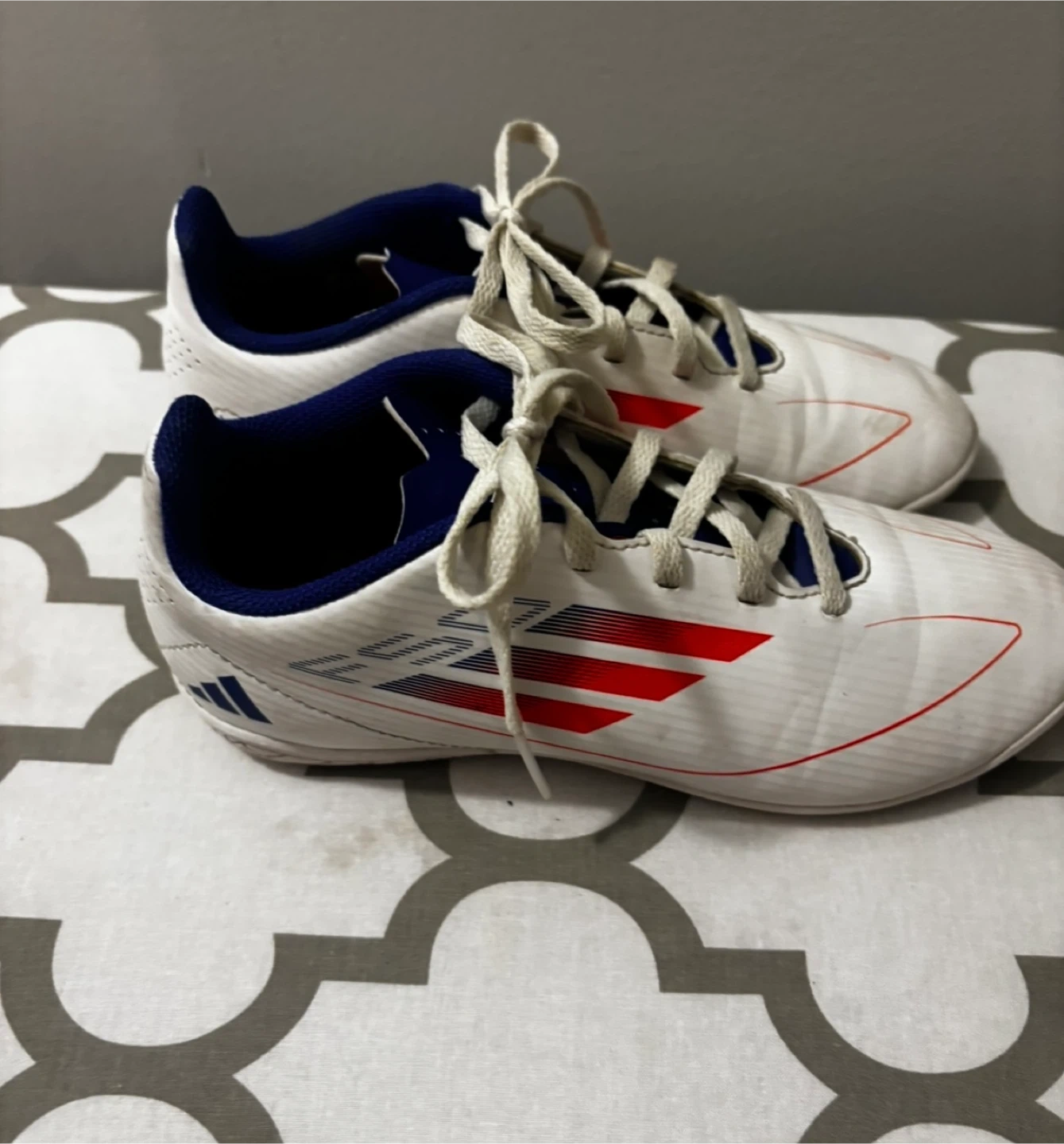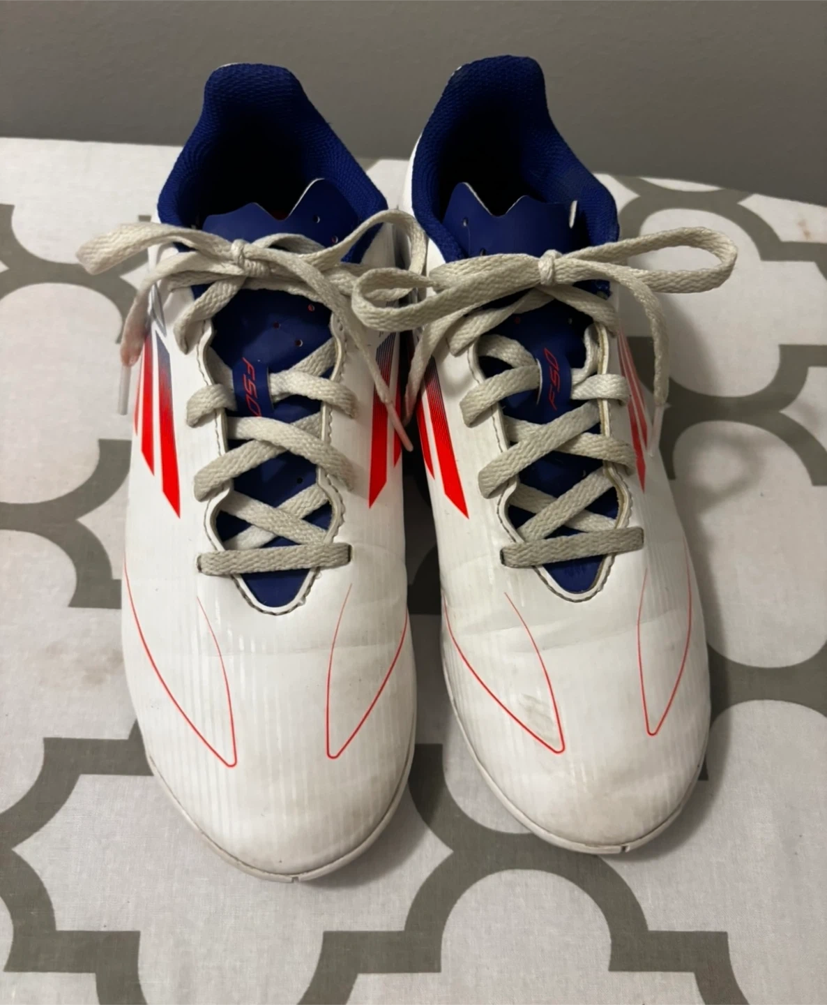 0Selling a pair of Adidas F50 soccer cleats in white, blue, and red. They're in good condition and ready for the field!
