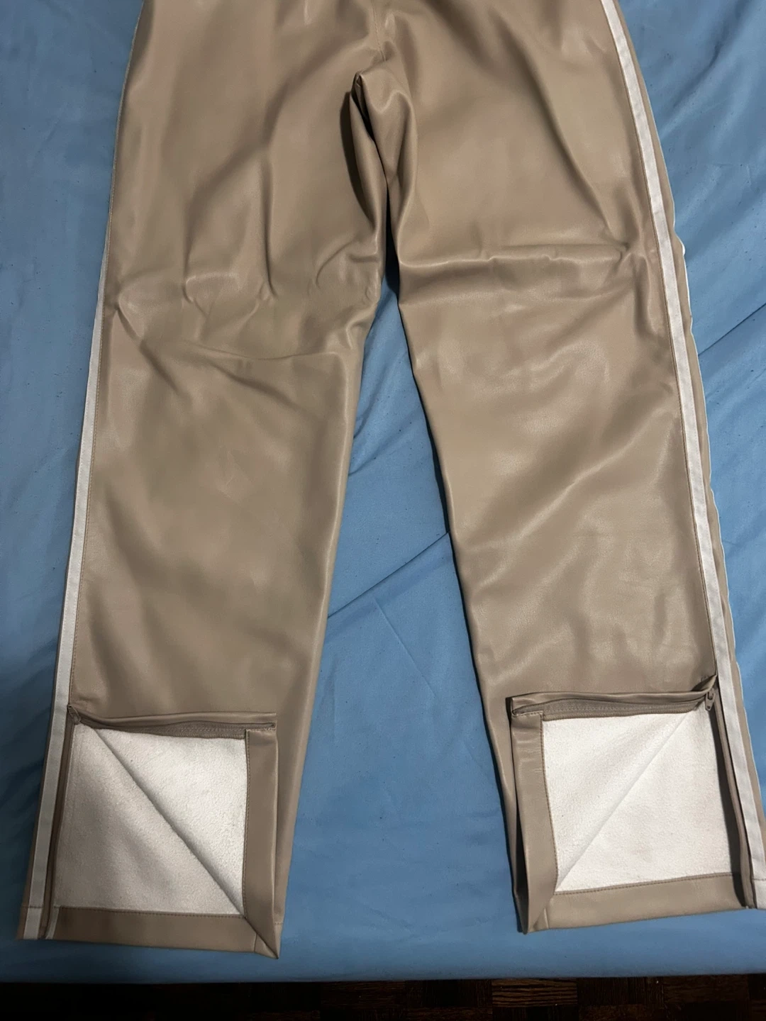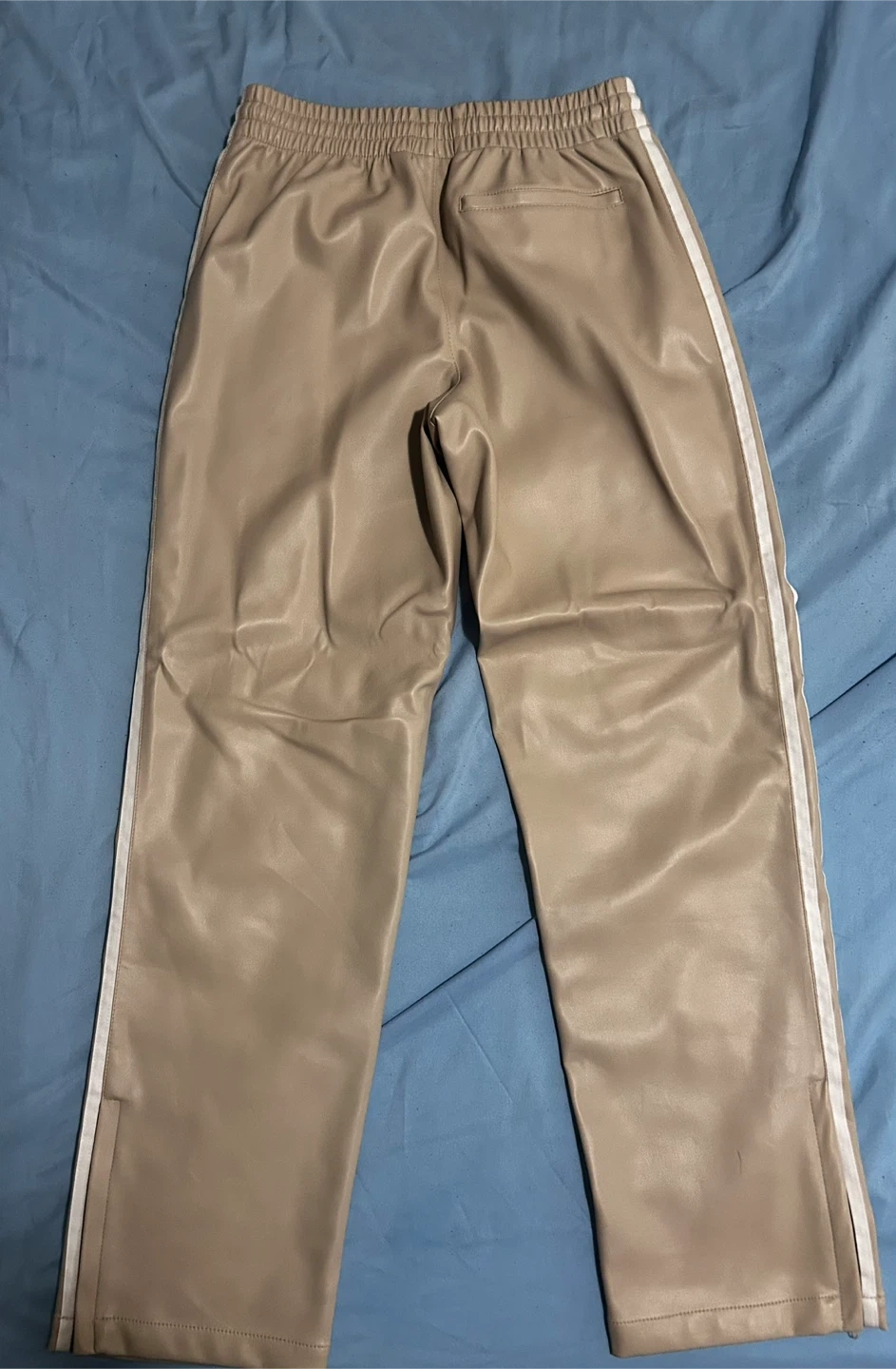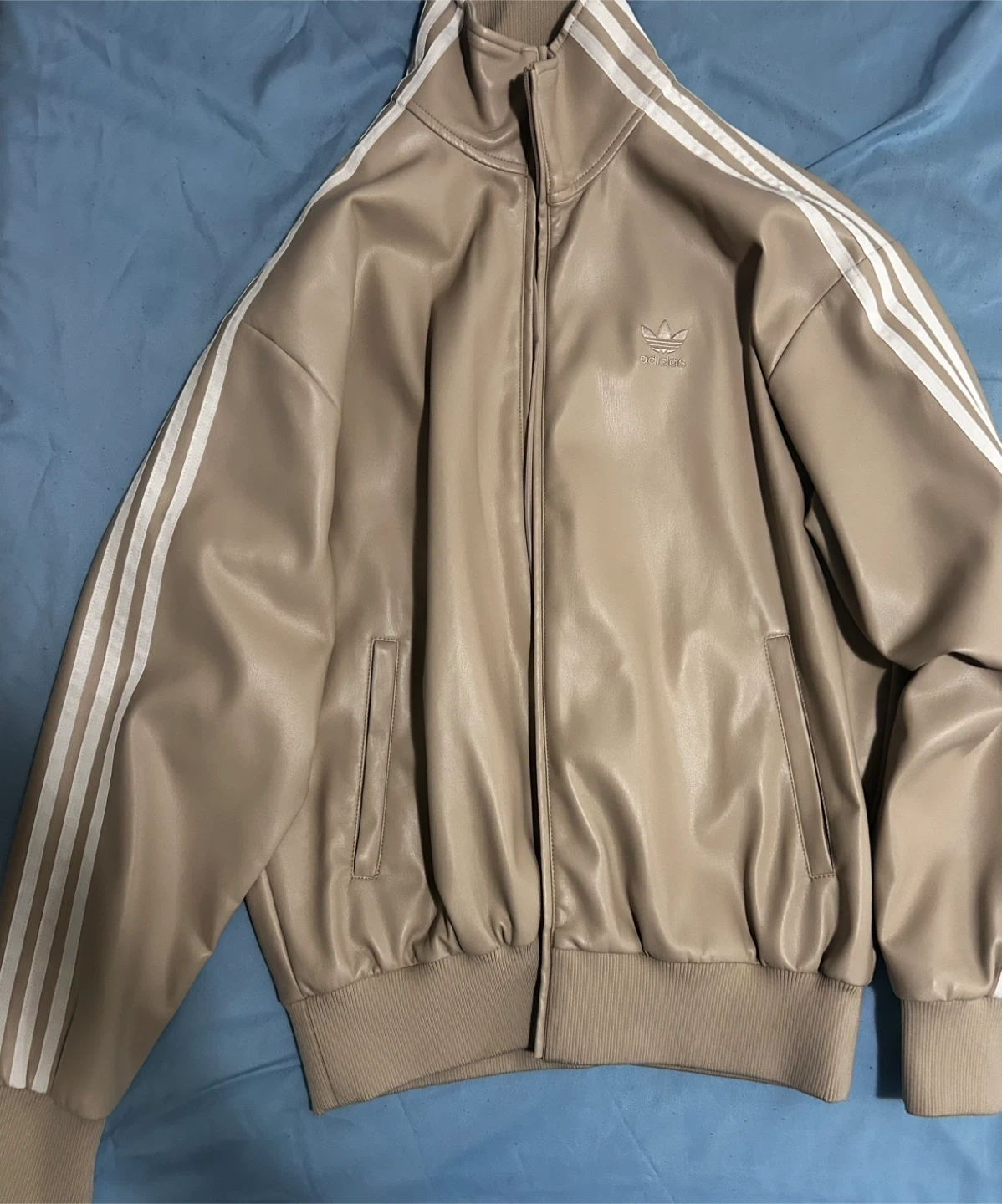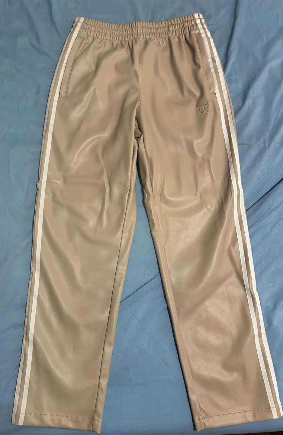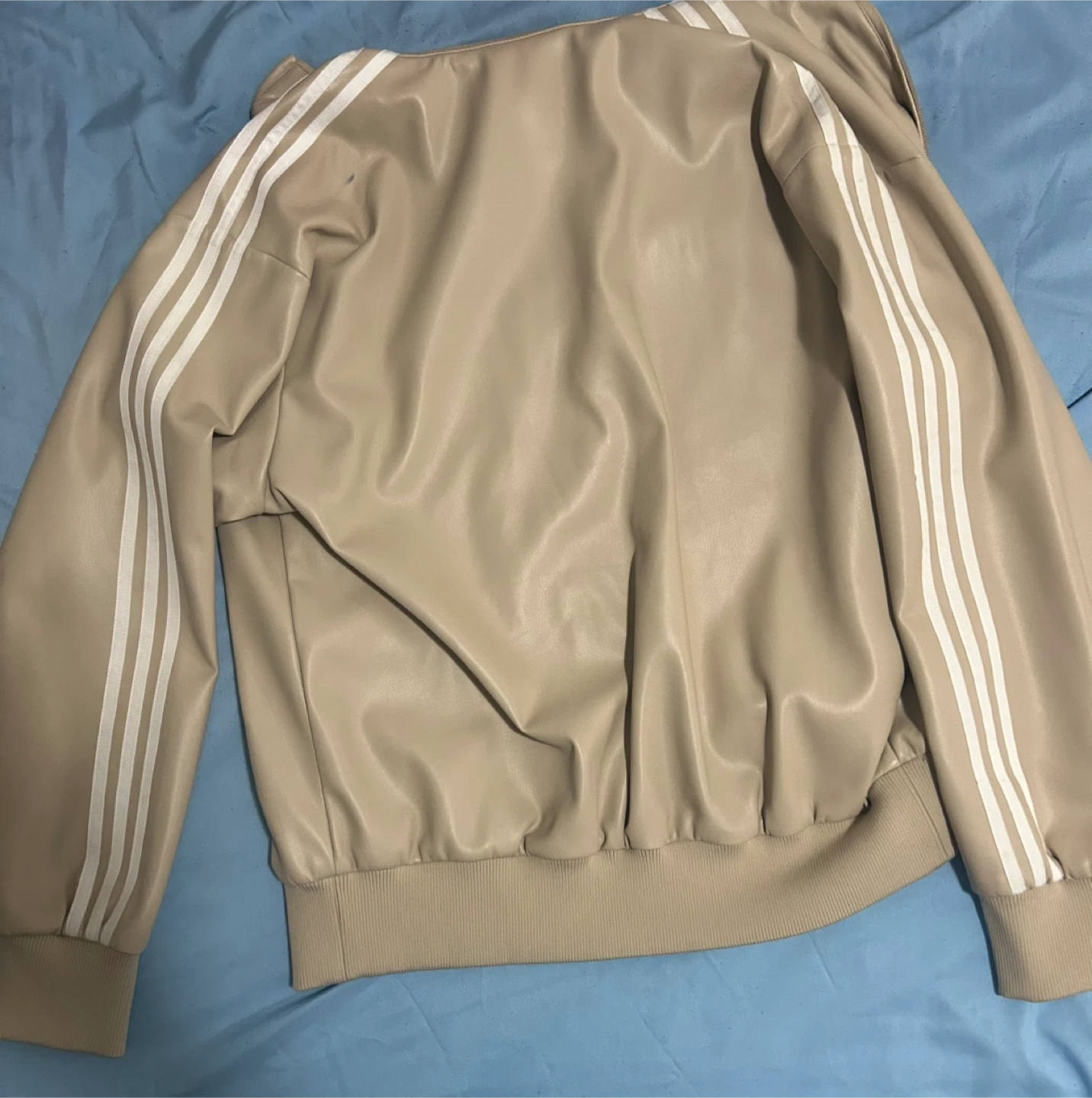 Selling a stylish Adidas faux leather tracksuit set. It includes both the jacket and pants, perfect for a trendy and comfortable look. The set features the classic Adidas three-stripe design in white. The colour is a neutral beige. Great for casual wear! Jacket medium 70$ Pants small (can fit large) 60$ Together 110$