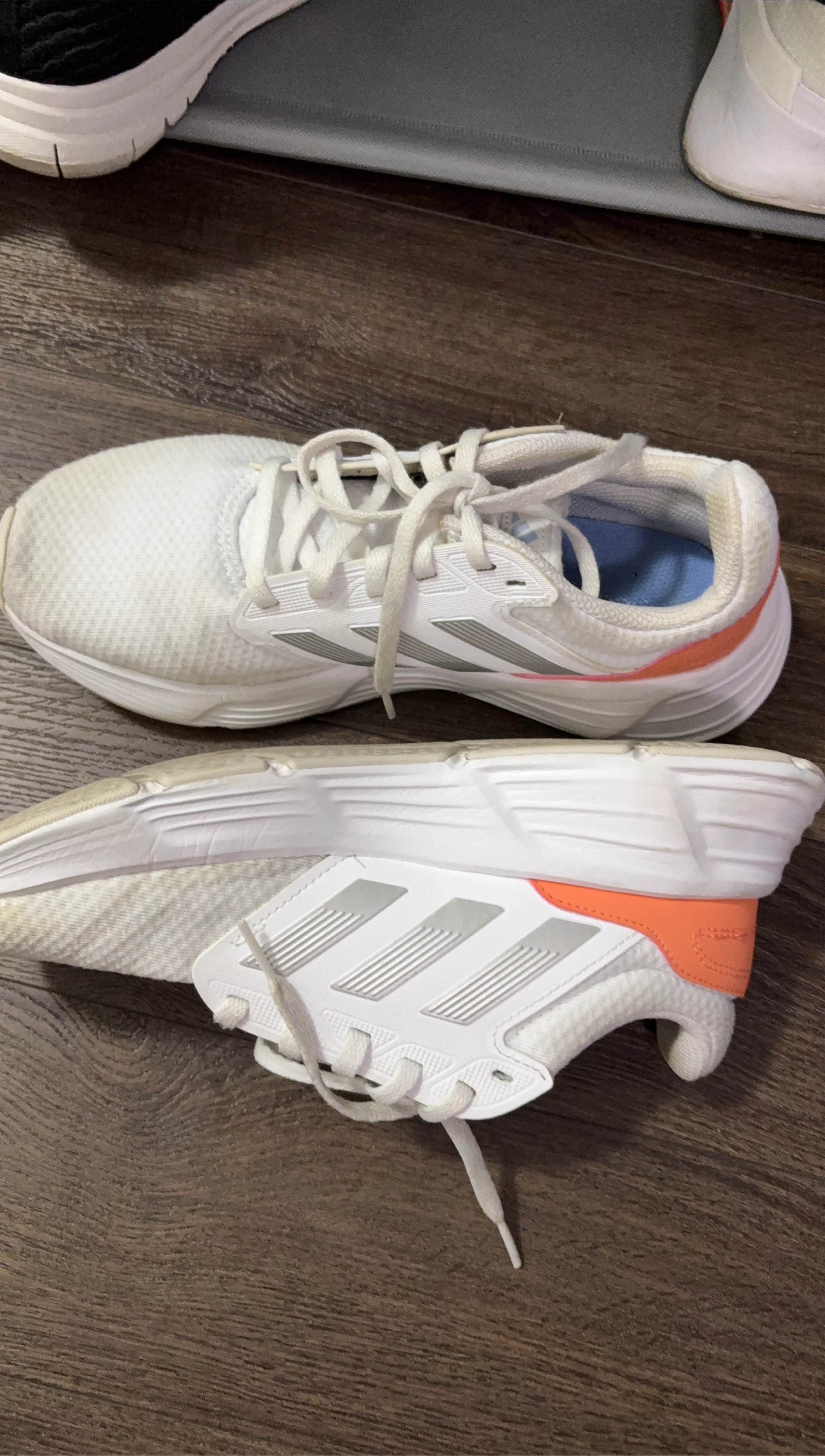 Selling a pair of Adidas Galaxy 6 running shoes in white. These are great for everyday wear or hitting the gym. They have a touch of orange accent. They are in good condition and ready for a new home!