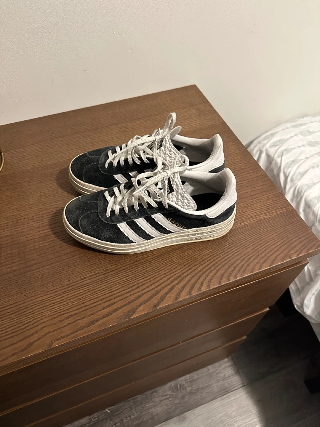 307Selling a pair of Adidas Gazelle sneakers in black and white. They're in good condition and ready for a new home!