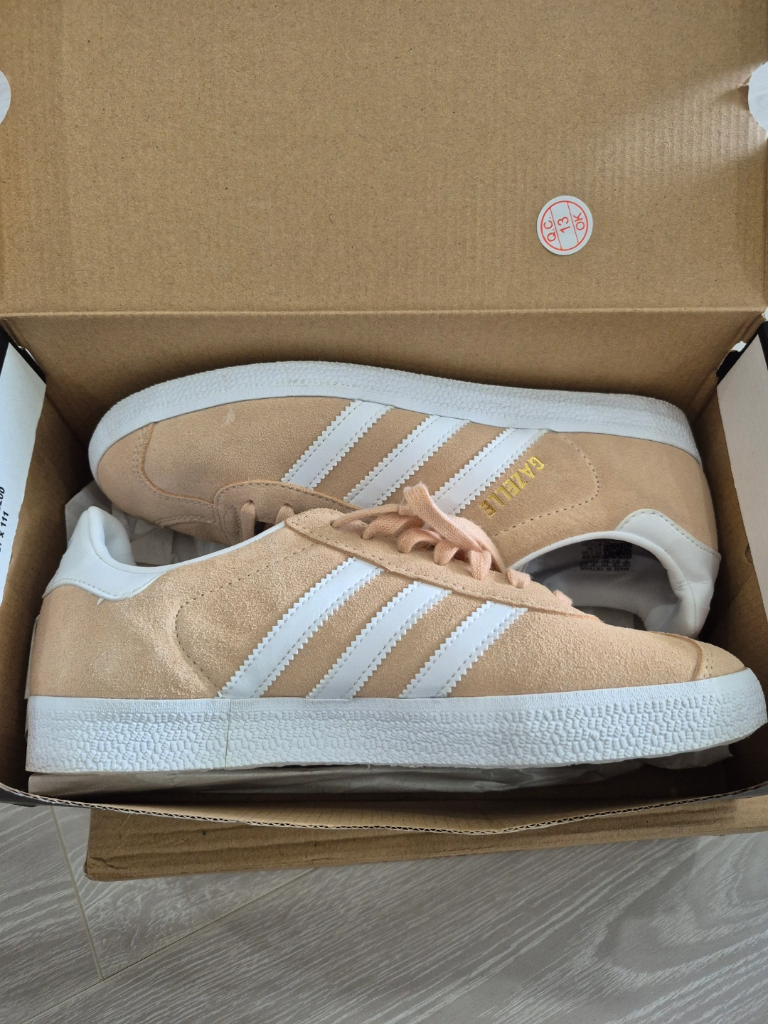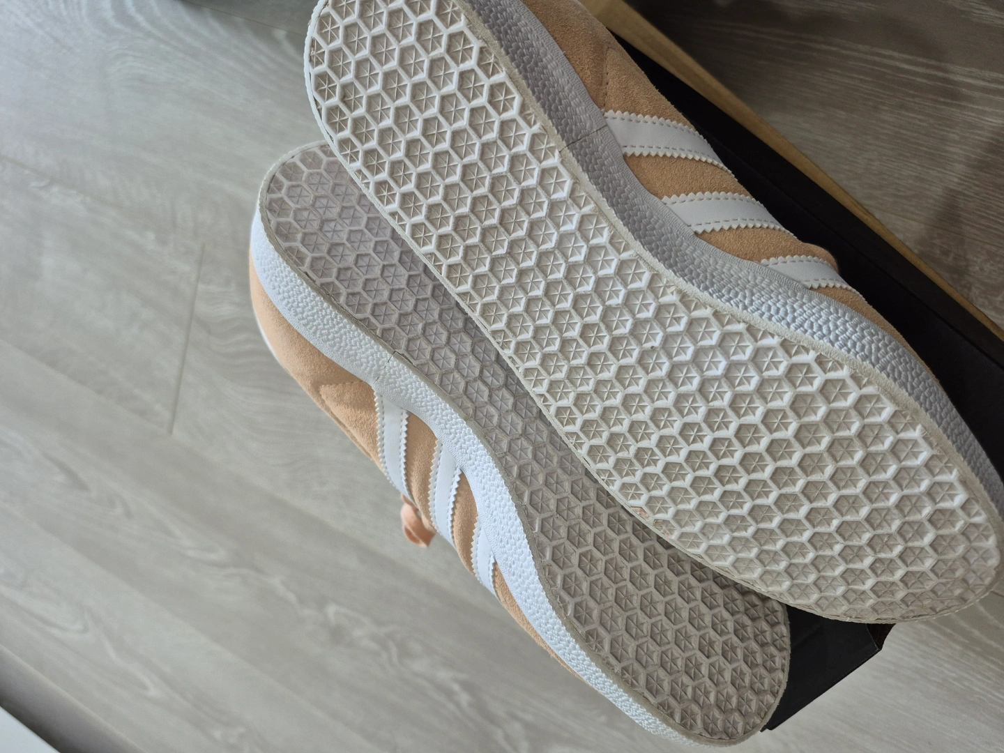 310Women's Adidas Gazelle sneakers. Beige suede upper, white stripes, and light peach laces. Floral insole design. Excellent condition, comes in original box.