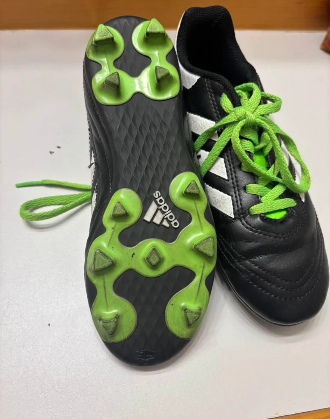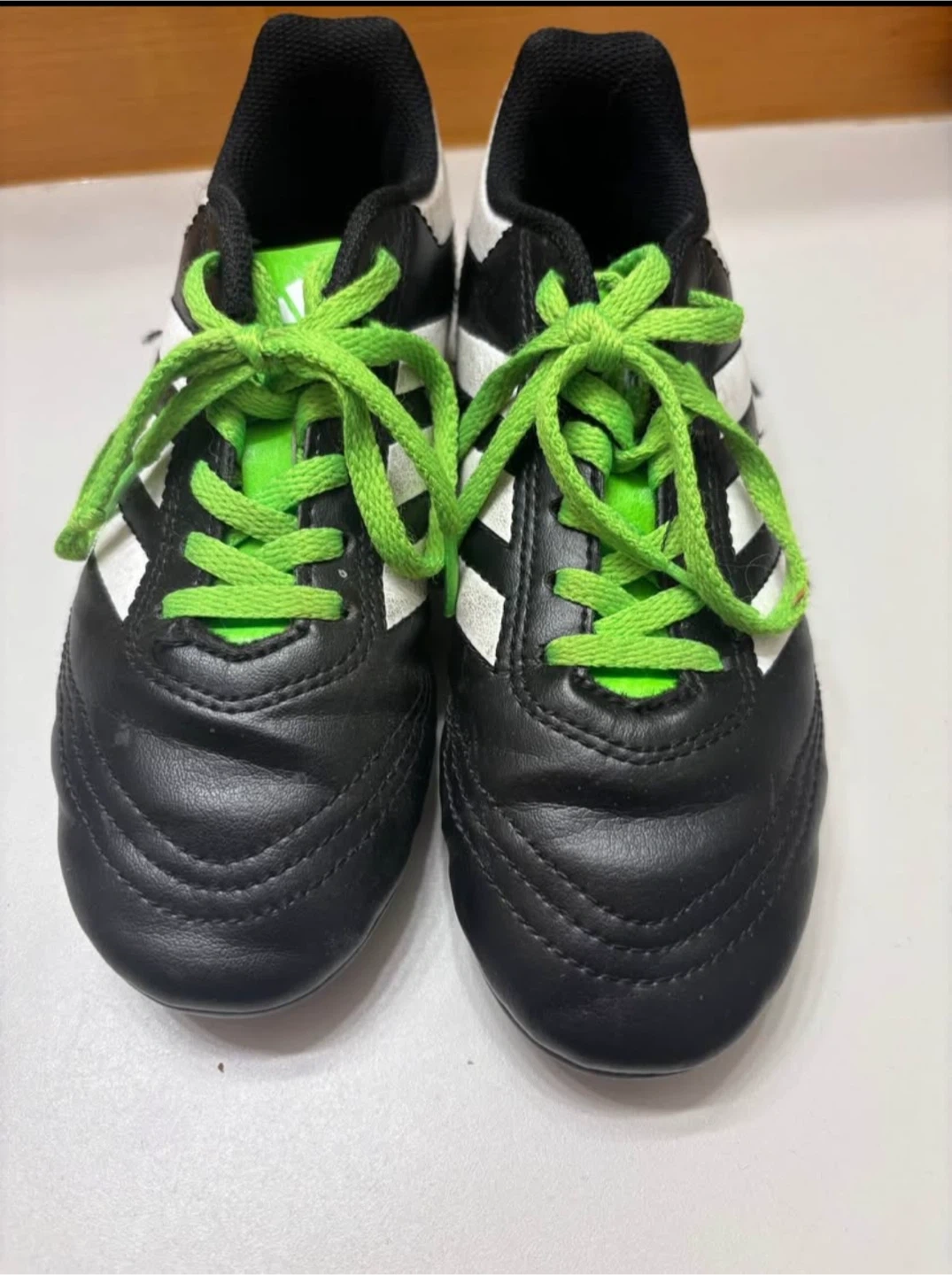 Selling a pair of Adidas Goletto VIII soccer cleats! They're black with white stripes and bright green accents. Perfect for the soccer field! Size 3