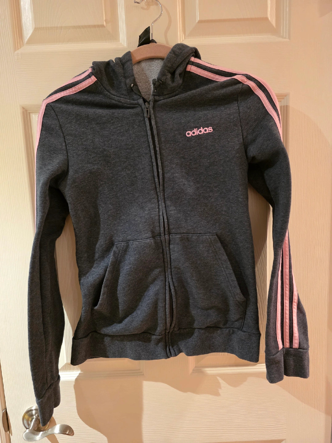 Selling an Adidas grey hoodie in size medium. It has pink stripes on the sleeves and the Adidas logo on the front. It's in great condition and super comfy!