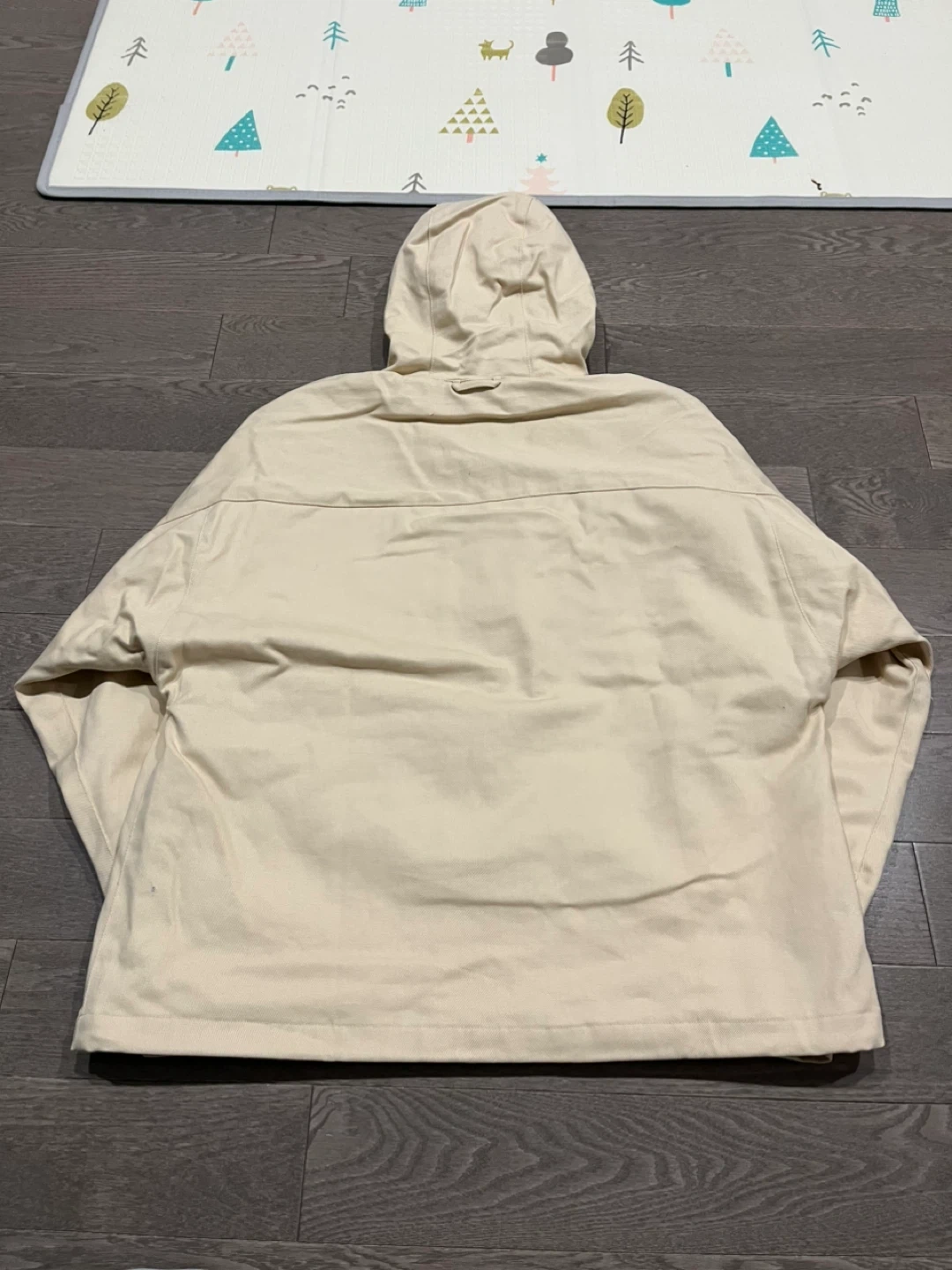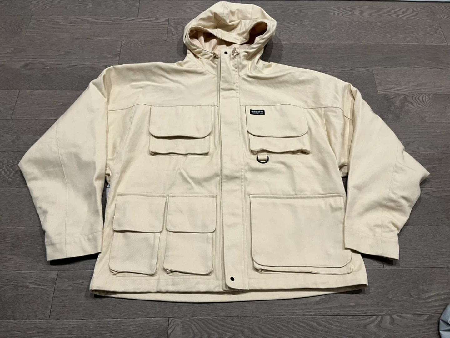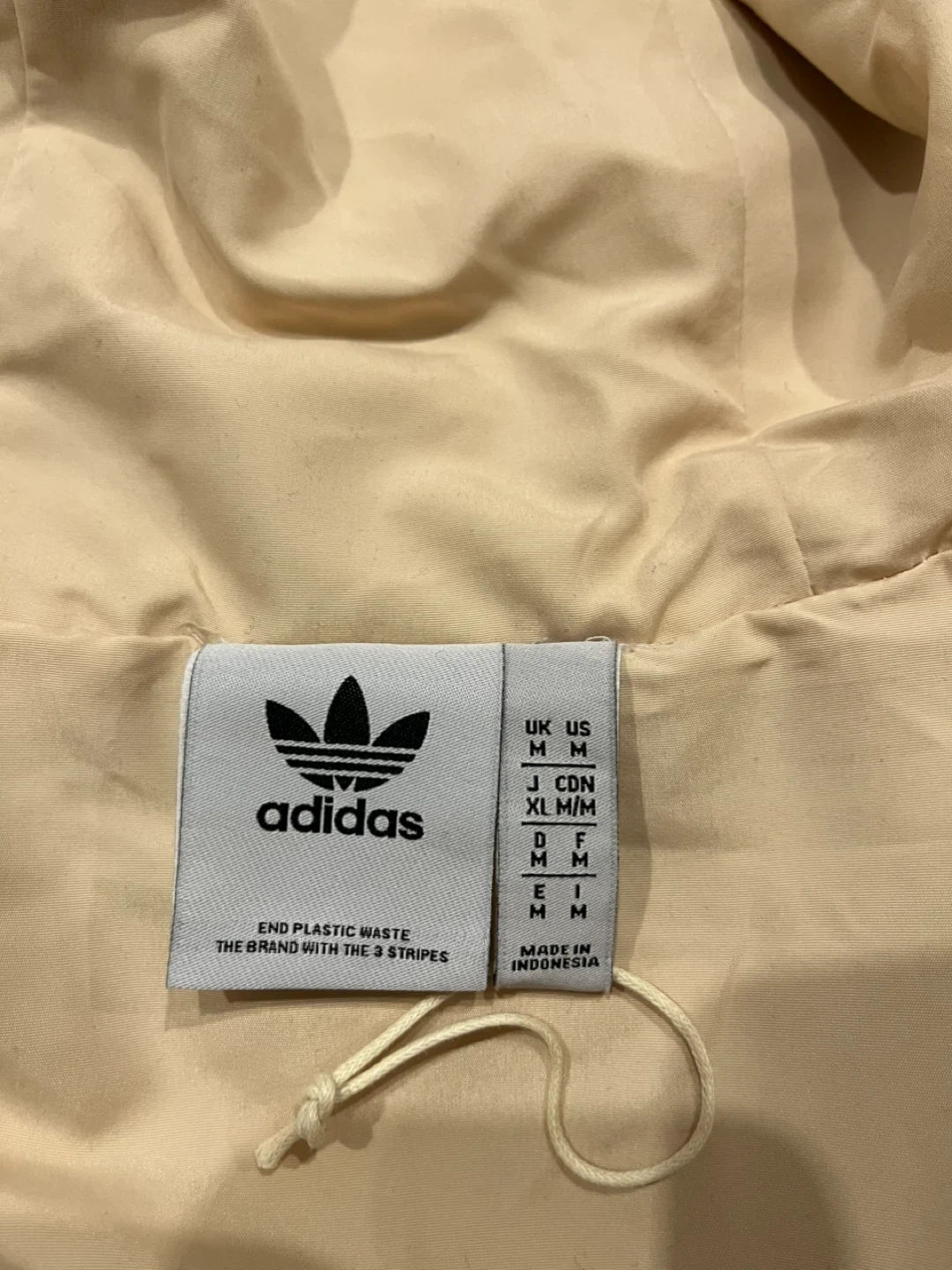 Here's an Adidas hooded jacket in a size M. It's a light beige colour and has lots of pockets on the front. The jacket is made in Indonesia.
