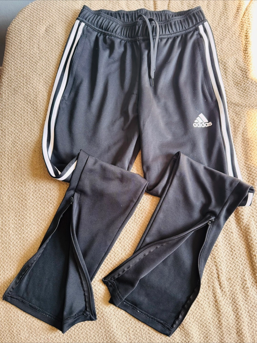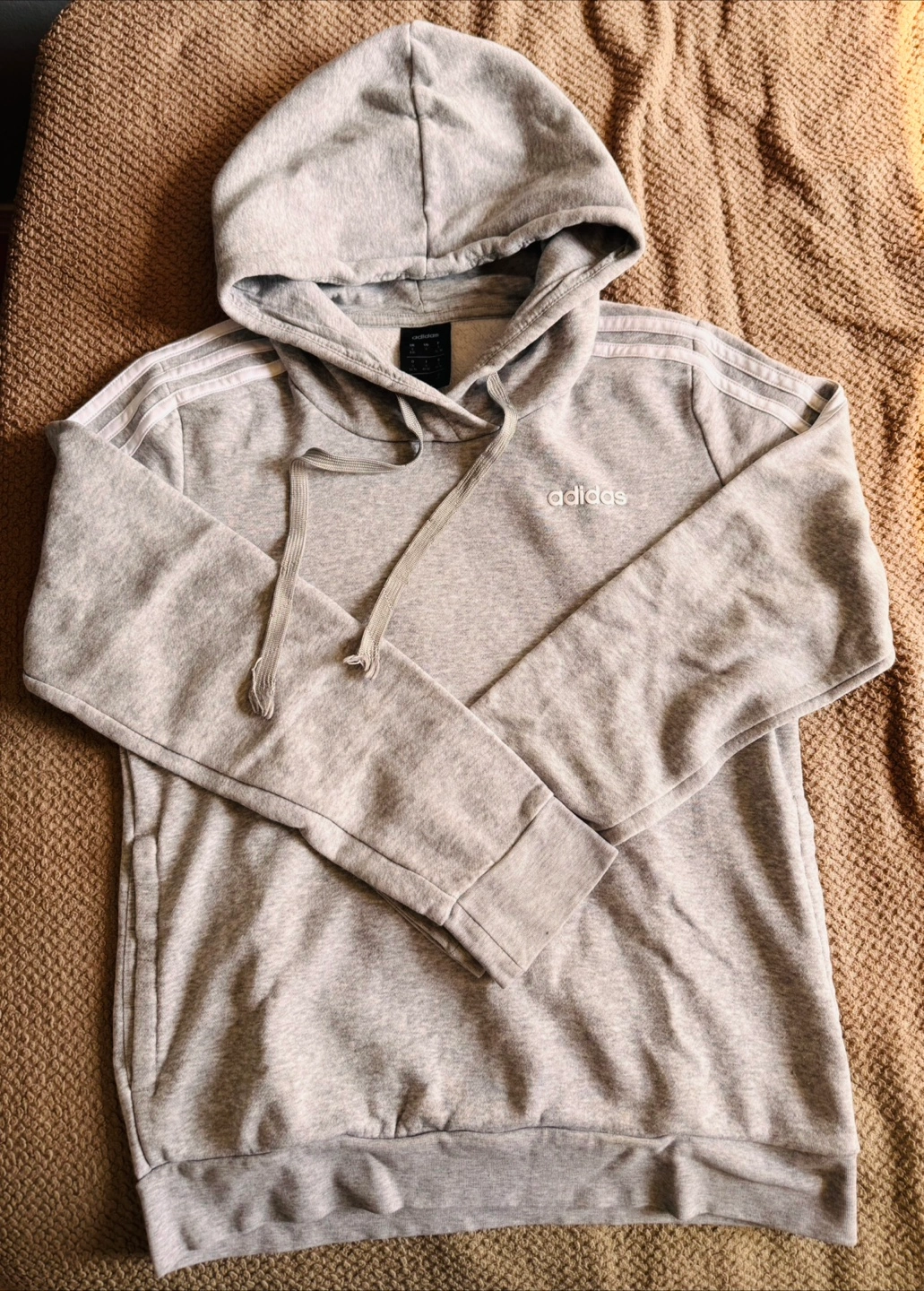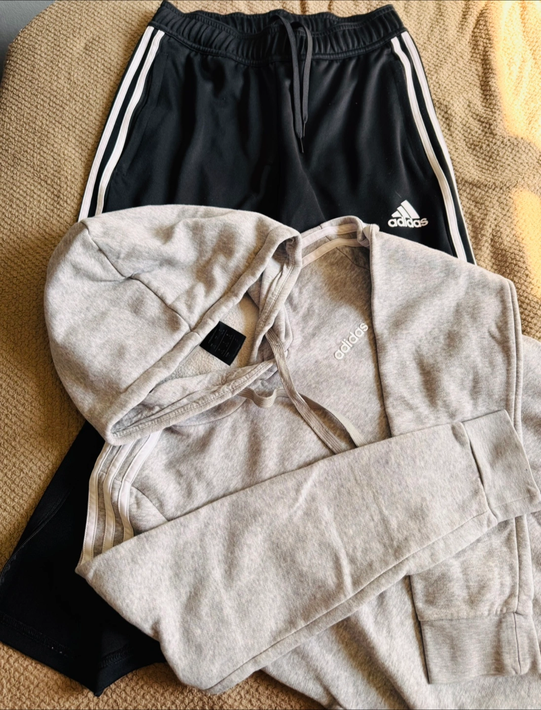 Selling a comfy Adidas hoodie and track pants set! The hoodie is a light grey colour with the classic three stripes on the sleeves. The track pants are black with white stripes down the sides and zippers at the ankles. Great for workouts or just lounging around the house.