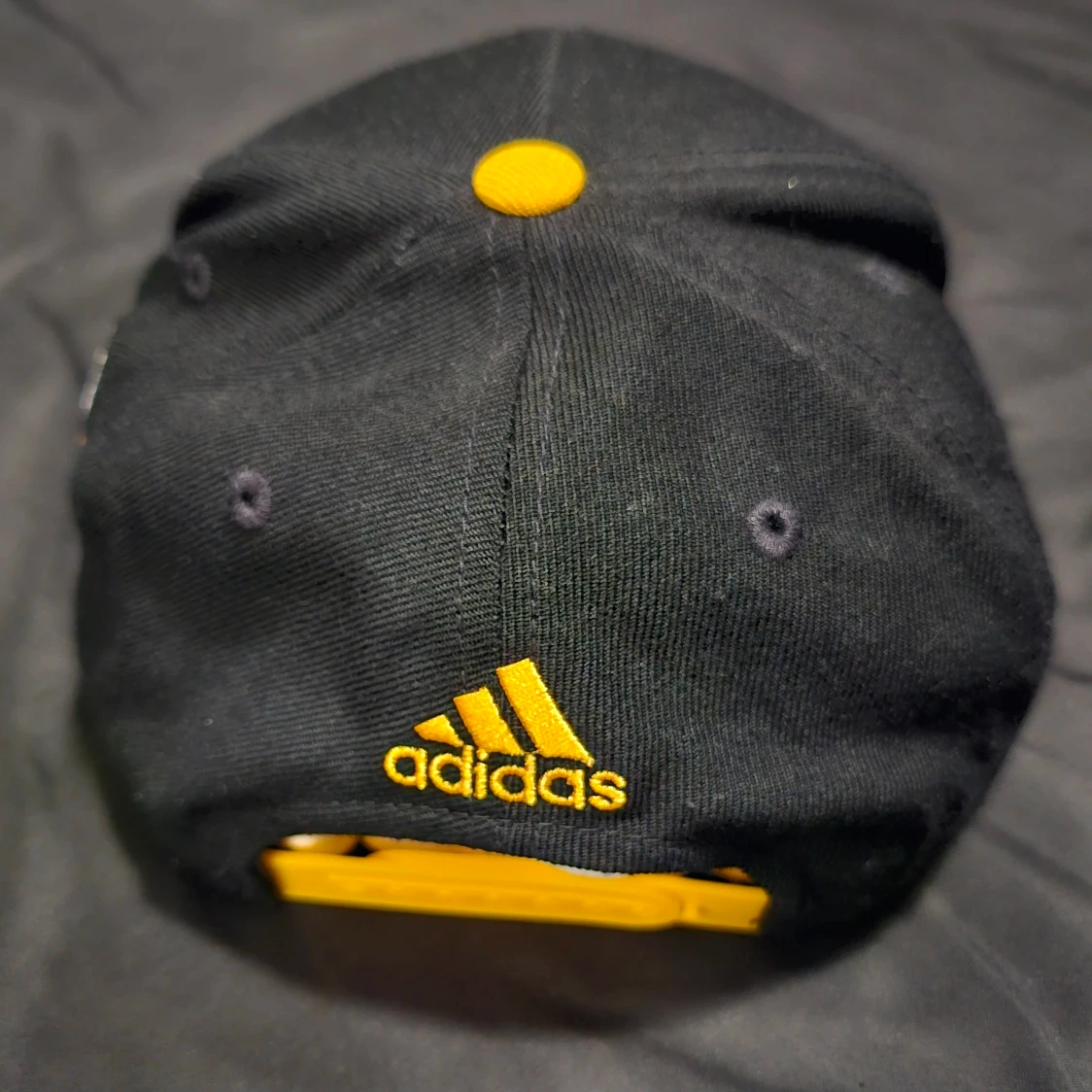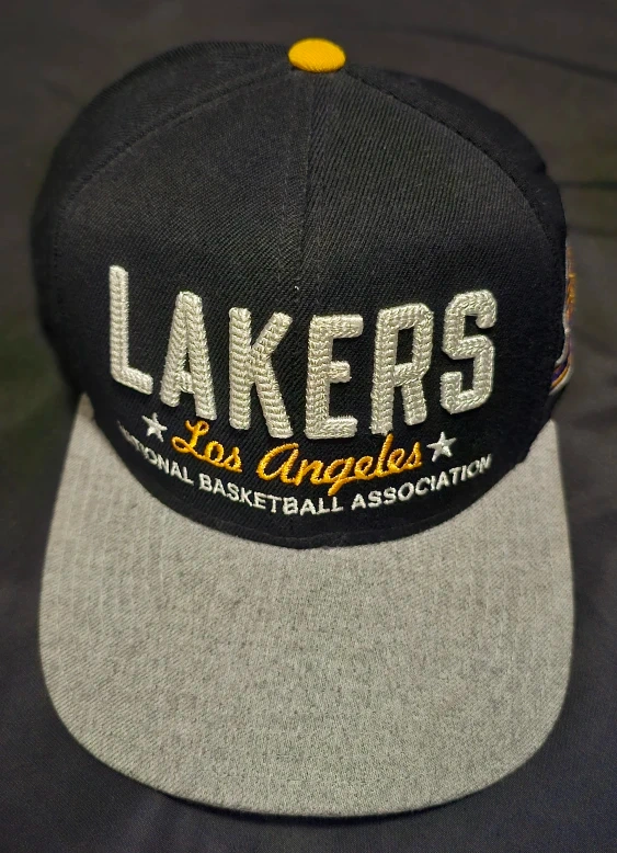 33Selling an Adidas Los Angeles Lakers NBA hat. The hat is black and gold with a grey brim. It features the Lakers logo and NBA branding. Perfect for any Lakers fan! snap back like new