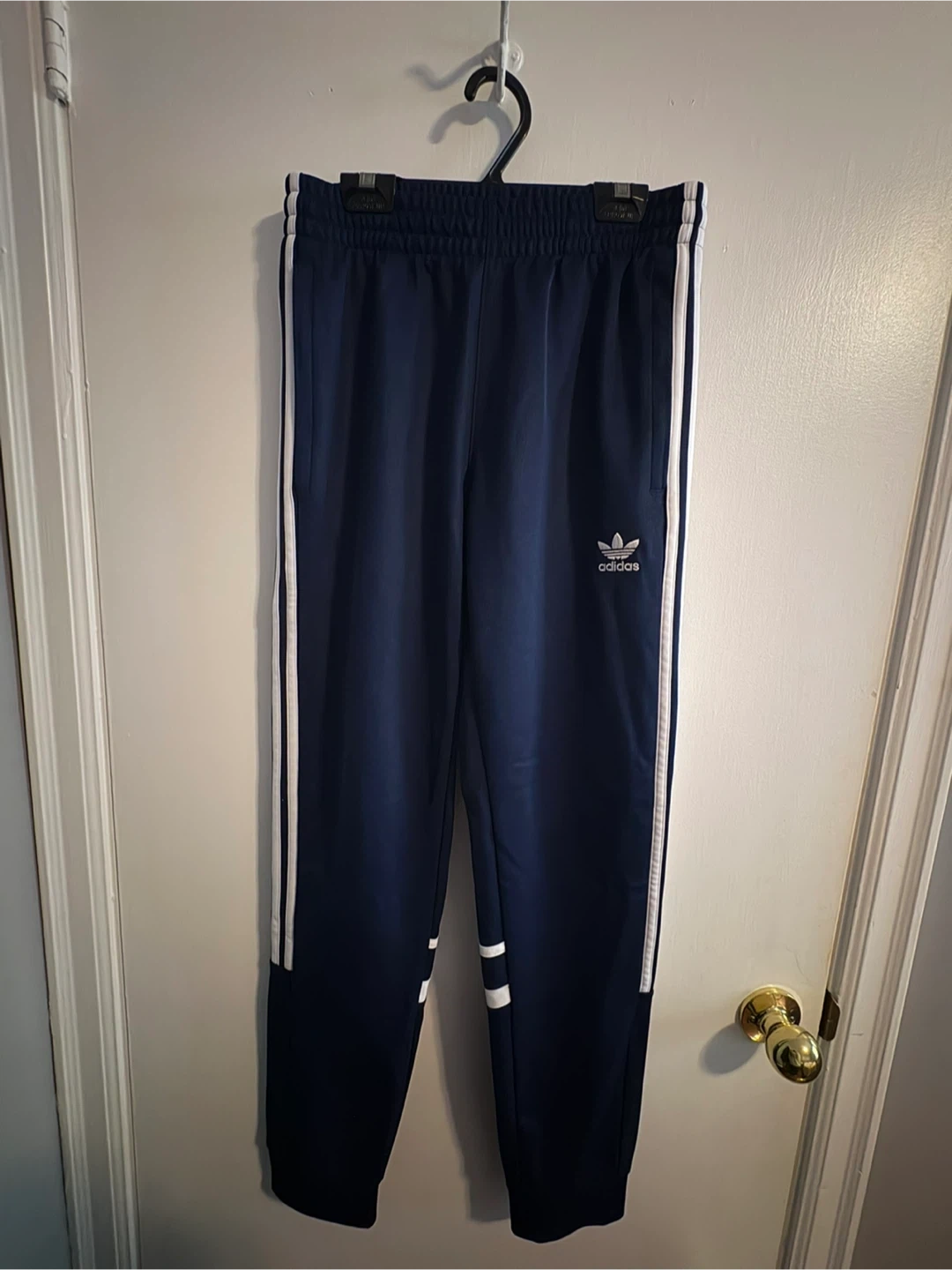 10Classic Adidas navy track pants with the iconic three stripes. Like brand new. Men’s size small.